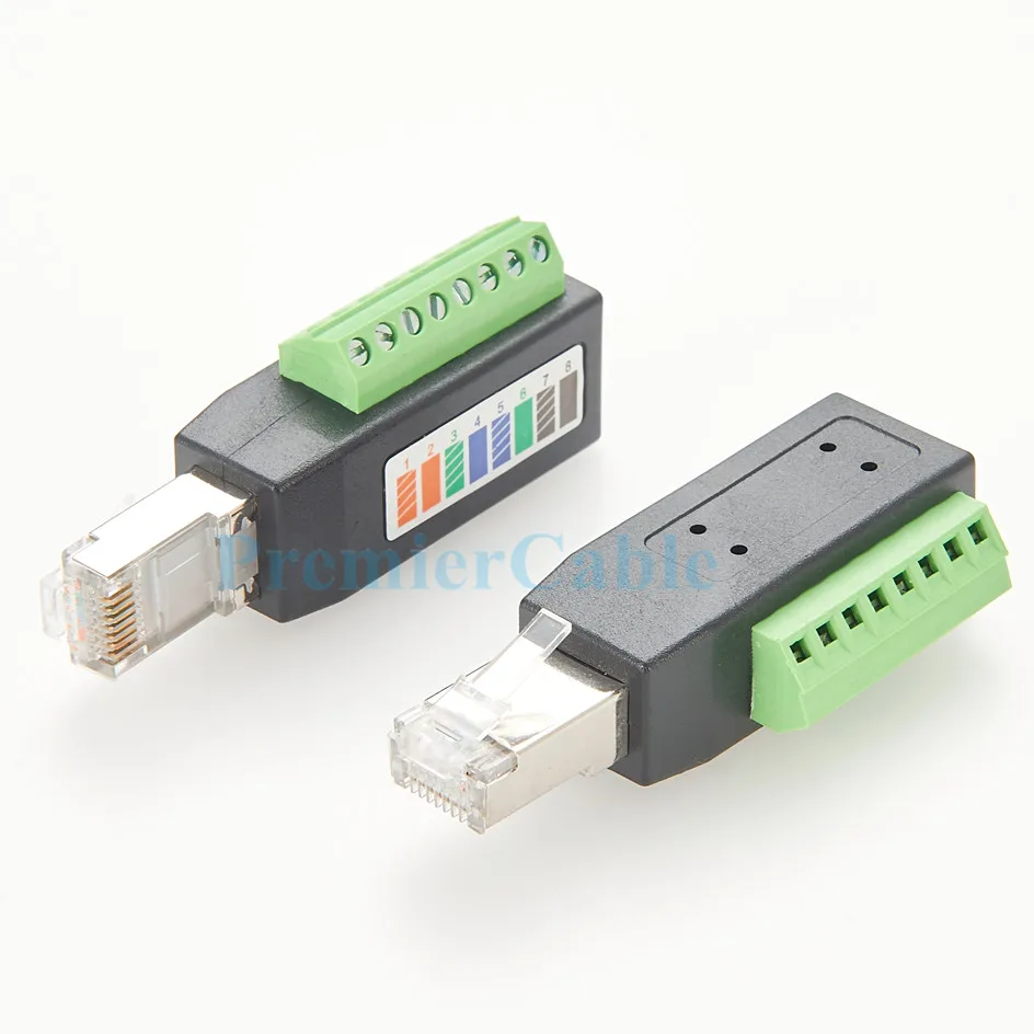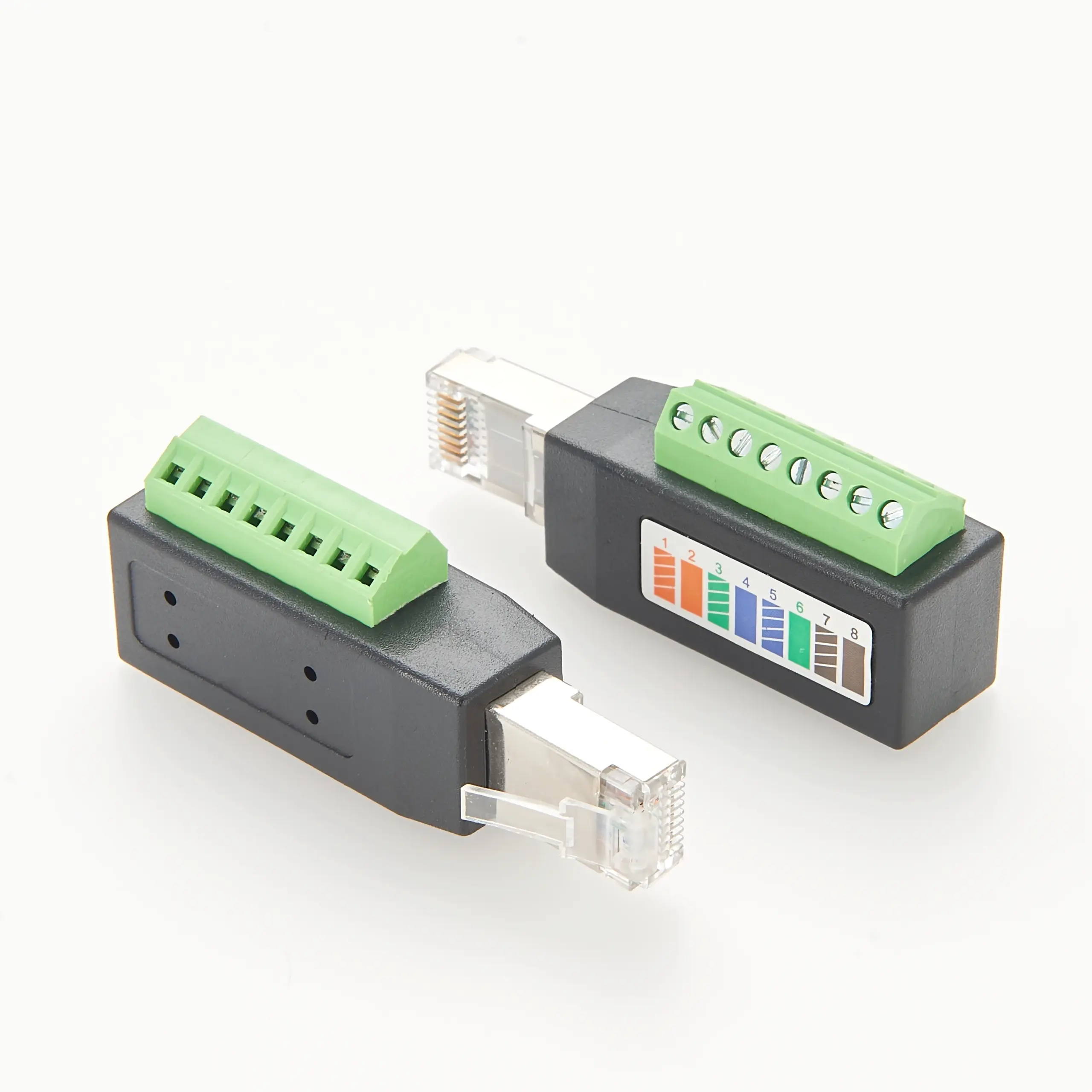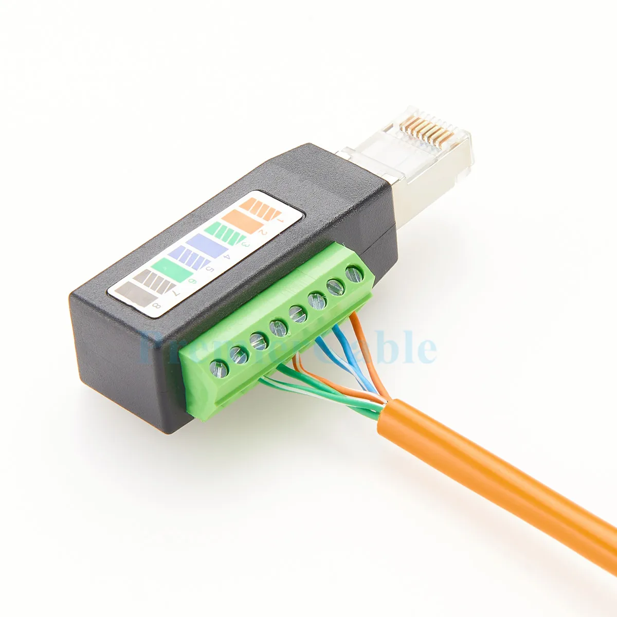 This RJ45 screw terminal connector features an 8P8C male interface compatible with Cat5, Cat5e, Cat6, and Cat7 cables, designed for Ethernet, AV, CCTV, and UTP DVR applications. Wired according to the EIA/TIA T568B standard, it improves electromagnetic interference shielding for reliable connections. Available in black and green, it comes in three models: Model A with a 0.3m cable to 8-pin screw terminal, Model B with direct RJ45 male to 8-pin screw terminal, and Model C with a 0.3m cable. The solderless design allows easy installation with just a screwdriver and wire stripper, making it suitable for routers, PCs, and modems—perfect for professional networking setups.