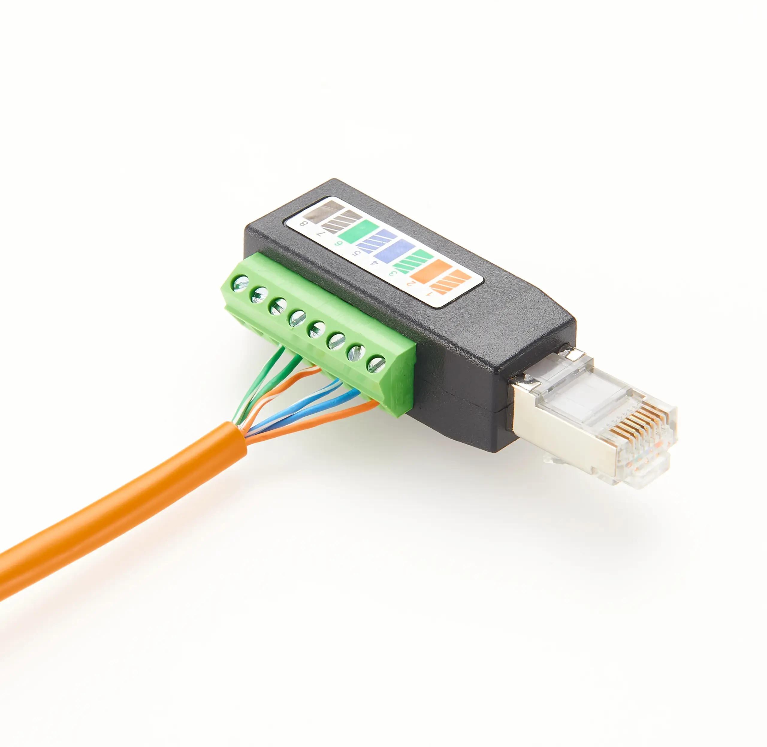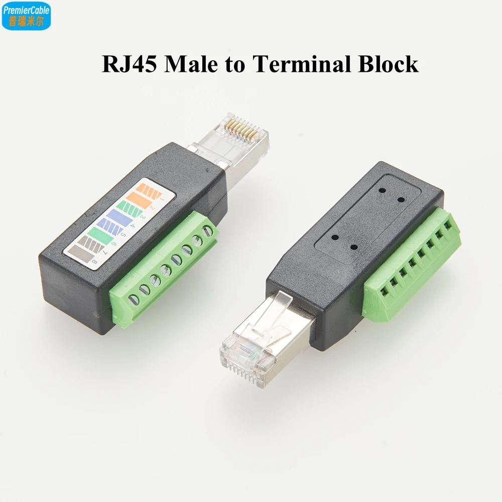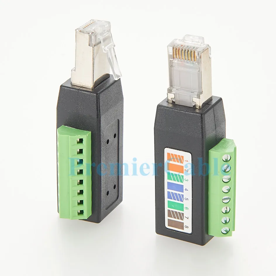 This RJ45 screw terminal connector features an 8P8C male interface compatible with Cat5, Cat5e, Cat6, and Cat7 cables, designed for Ethernet, AV, CCTV, and UTP DVR applications. Wired according to the EIA/TIA T568B standard, it improves electromagnetic interference shielding for reliable connections. Available in black and green, it comes in three models: Model A with a 0.3m cable to 8-pin screw terminal, Model B with direct RJ45 male to 8-pin screw terminal, and Model C with a 0.3m cable. The solderless design allows easy installation with just a screwdriver and wire stripper, making it suitable for routers, PCs, and modems—perfect for professional networking setups.