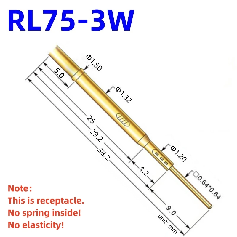 Experience seamless electronic testing with this precisely manufactured RL75-3W test pin, designed to offer superior conductivity and durability. Crafted from high-grade brass with a gold surface, these test pins reflect a sleek, shiny metallic finish that exudes professionalism and quality. With a total length of 38.2mm and an outer diameter of 1.32mm, each pin features a smooth, cylindrical shape with consistent construction. The narrow body and flat-cut ends showcase a minimalistic, refined design ideal for insertion into test receptacles. The gold finish enhances corrosion resistance and guarantees long-lasting performance. As you incorporate these test pins into your testing setup, you'll notice how their polished, high-quality aesthetic elevates your work environment, ensuring precise and dependable results every time.