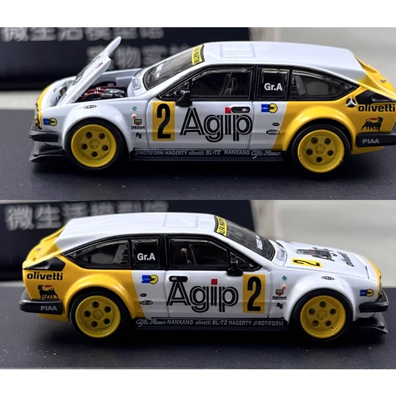 Experience the thrill of racing with the RM 1/64 Alfa Romeo GTV6 diecast model, an eye-catching collectible that embodies style and performance. With its stunning white finish and vibrant yellow accents, this detailed model captures the essence of the legendary Alfa Romeo GTV6. The sleek, aerodynamic design features a prominent grille and round black headlights, showcasing its sporty appeal. Racing stickers and bold decals add character, while the textured wheels and interior visible through clear windows make this piece truly special. Perfect for display, this model combines quality and aesthetic excellence, making it a must-have for collectors and enthusiasts alike.