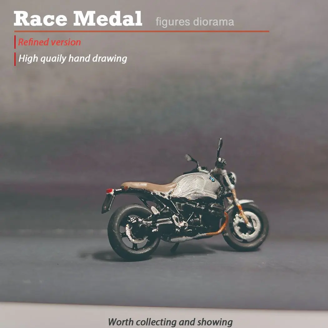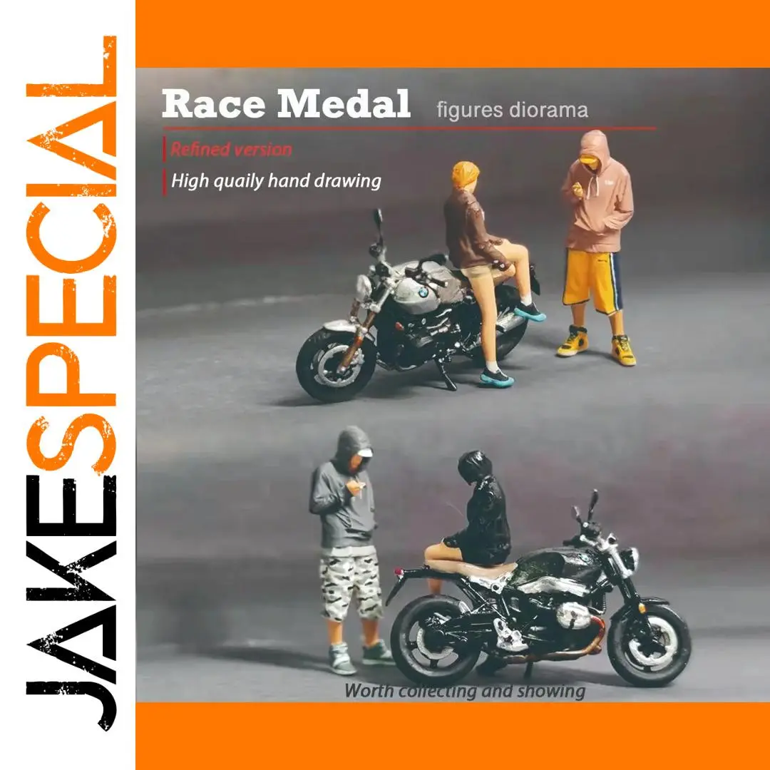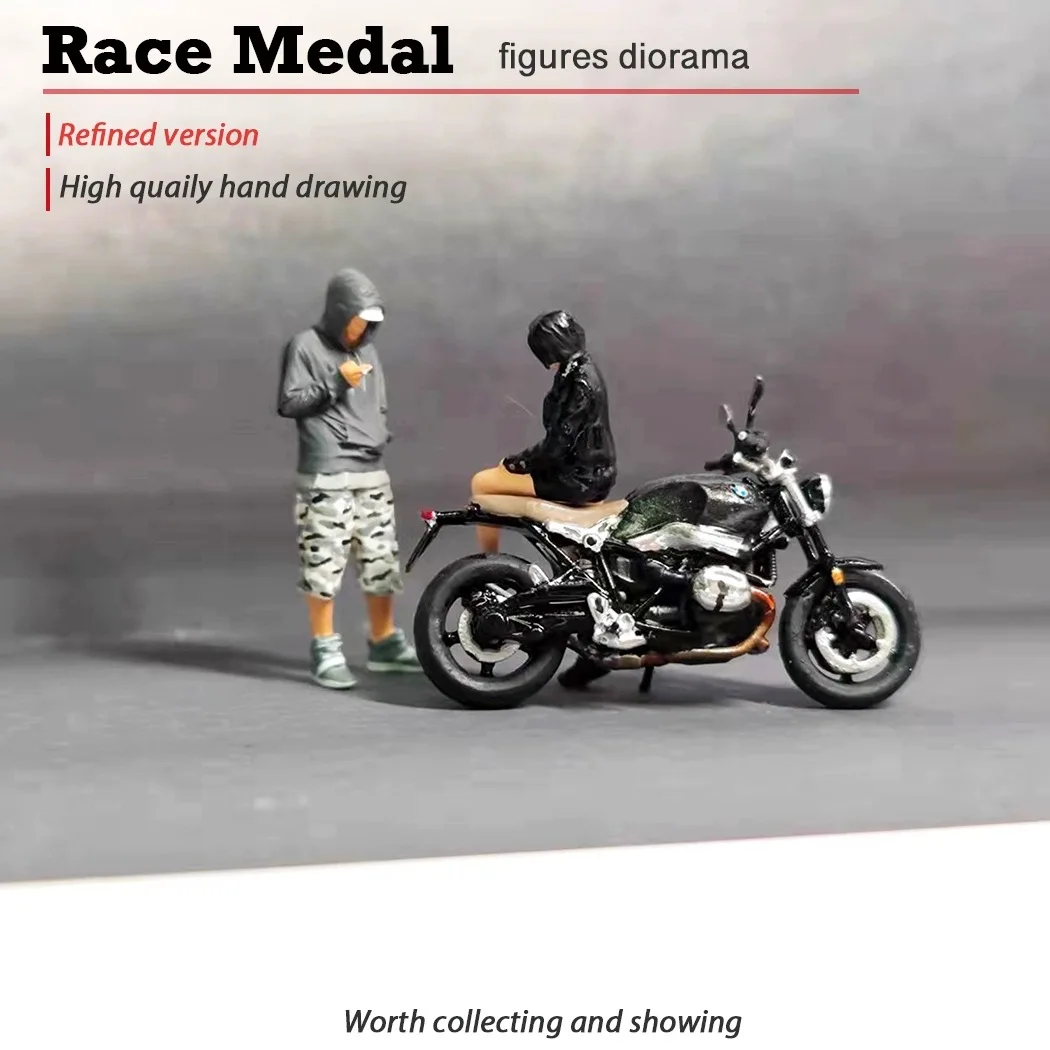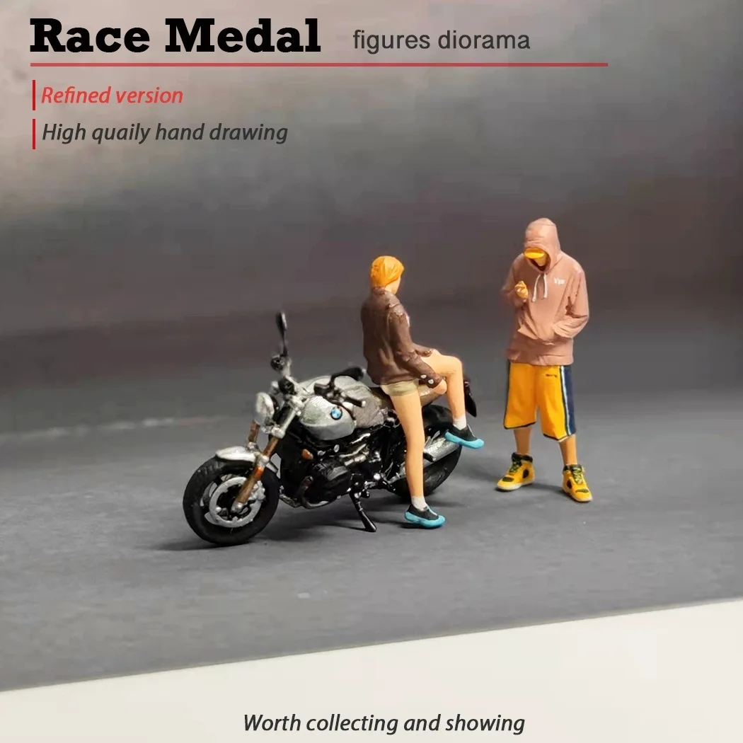 Step into a world of detailed craftsmanship with this high-quality RM 1:64 mini figurine set, capturing a lively outdoor motorcycle scene. At just 1.1″ tall, these miniatures are precision-crafted from durable PVC resin, weighing approximately 25 grams for stability. They depict four casually dressed figurines engaged in a relaxed conversation and activities, with textured clothing featuring seams, folds, and accessories like sunglasses for added realism. The scene also includes two meticulously detailed motorcycles, one in sleek black and the other in silver, showcasing handlebars, wheels, and engine components. This set creates an authentic, everyday vibe and makes a perfect display for collectors or enthusiasts who appreciate fine detail and realistic storytelling.