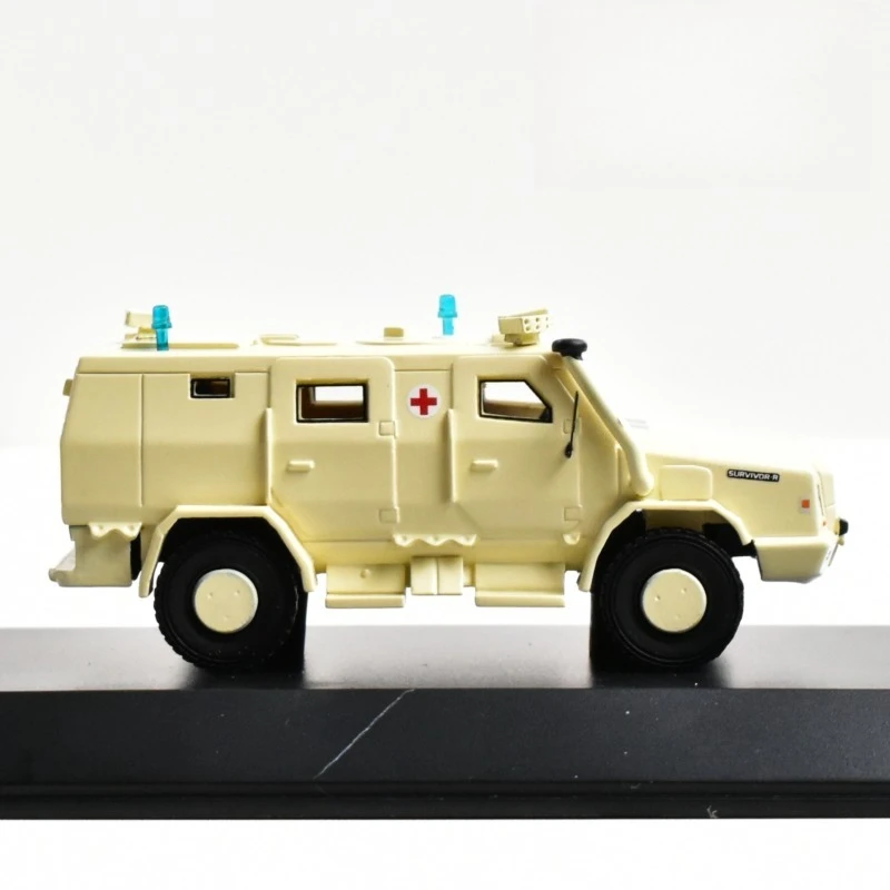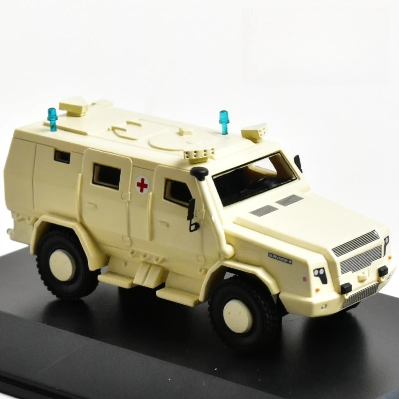 The BOS 1/87 RMMV Survivor R-Polizei diecast metal model vehicle is a stunning representation of precision and detail designed for adult collectors. The left model showcases a sleek silver body with blue accents and bold “POLIZEI” lettering, complemented by blacked-out windows and molded features like side mirrors and a roof light bar. The right model, finished in rugged beige, highlights a red cross emblem, suggesting a medical role, along with molded antennae and a robust grille. Each model is mounted on a black stand, with both showcasing black wheels and intricate detailing, perfect for display in any collection.