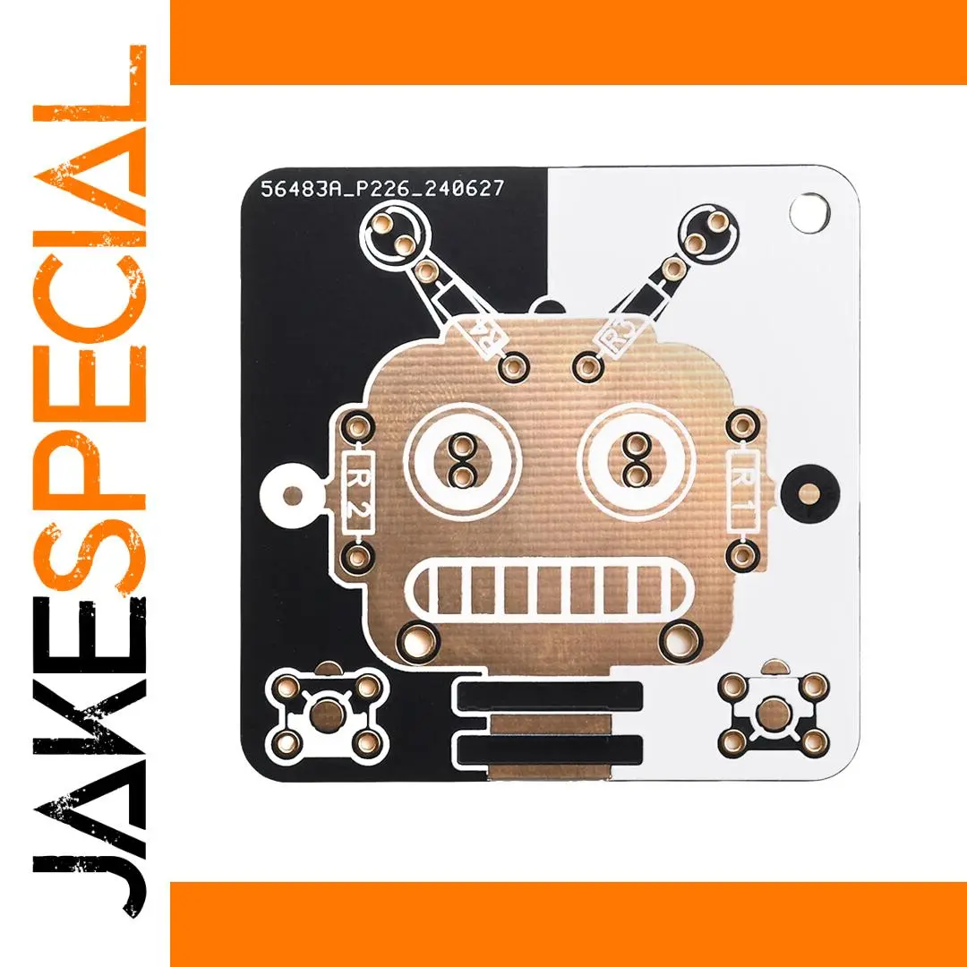 - Includes a black or white 5×5 cm PCB featuring a stylized robot face design with copper-colored outlines, circular eyes, a rectangular mouth with vertical teeth, and antennas for a playful look.
