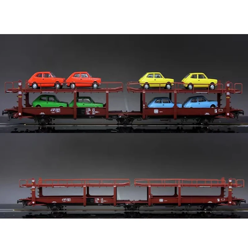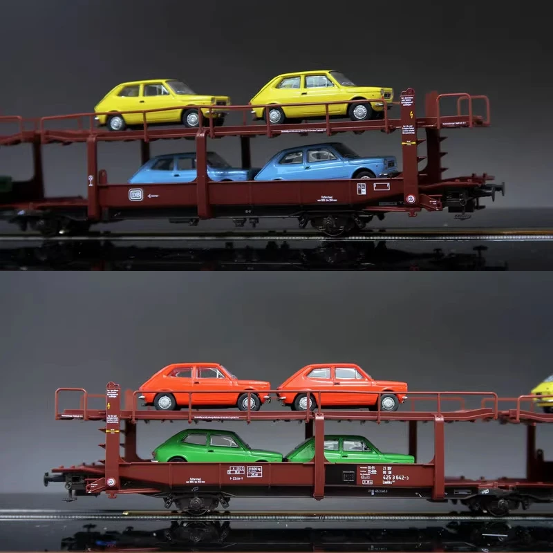 Experience the impressive craftsmanship of this highly detailed 1:87 scale model, measuring approximately 275mm in length. Designed for collectors and enthusiasts, this double-decker transport carriage features a rich brownish-red color, complemented by a black chassis and realistic wheels. The upper deck is secured with slender metal safety bars, adding a touch of authenticity and safety detail. Loaded with miniature cars painted in bright yellow, green, and blue, the model offers vibrant visual contrast against the train’s subdued tones. Its finely detailed doors, windows, and undercarriage make it a true miniature transportation marvel. Whether displayed or used as part of a train set, this model promises both realism and visual appeal that captures the essence of modern freight trains.