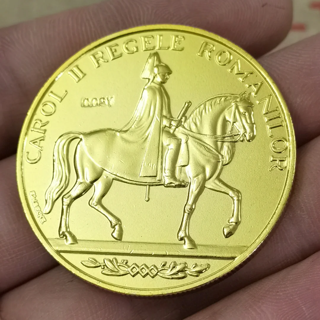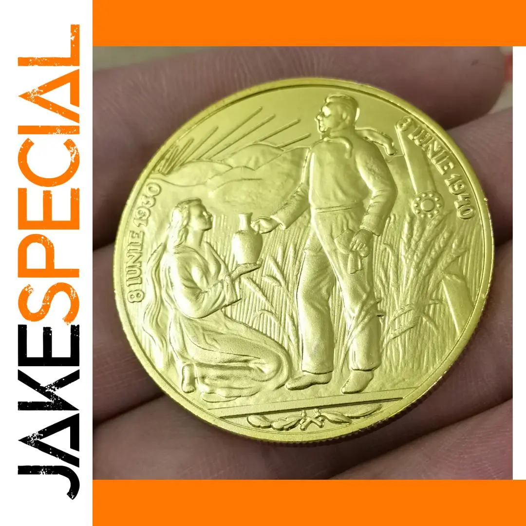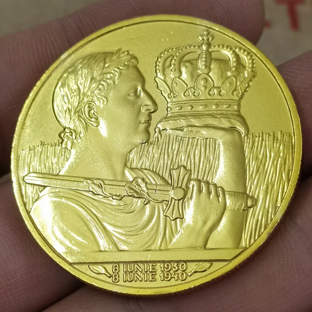 Immerse yourself in history with this beautifully crafted replica of the 1940 Romania 12 Ducat coin featuring King Carol II. Crafted with meticulous detail, this coin boasts a rich golden hue and a polished, shiny finish that captures the grandeur of its original design. The highly embossed surface depicts a regal king standing confidently in period attire, holding a branched item, alongside a kneeling woman in a flowing traditional robe with a vessel. The background showcases majestic mountains and radiating lines symbolizing illumination, accented by decorative laurel or floral motifs at the bottom. This antique European-style coin blends craftsmanship and historical symbolism, making it an elegant addition to any collection or display.