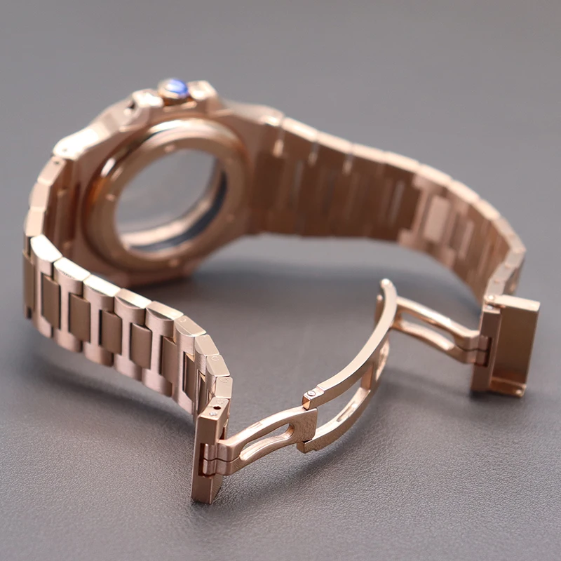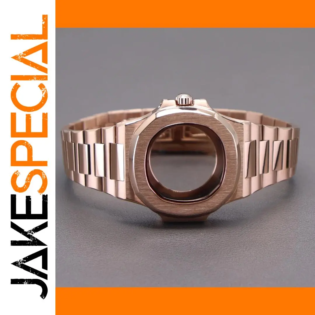 Experience timeless style with this refined rose gold 40mm watch case, crafted from durable solid 316L stainless steel. Its polished and brushed finish creates a sophisticated contrast, highlighting the luxurious warmth of the rose gold tone. The sleek, seamless bezel and clear sapphire crystal glass front deliver a contemporary silhouette that fits perfectly with modern aesthetics. Designed to house a dial between 29.5mm to 30.8mm, this case seamlessly supports NH34, NH35, NH36, and NH38 (4R36) movements, offering versatility for various watch modifications. The robust construction ensures water resistance up to 100 meters, making it suitable for everyday wear and aquatic adventures. Its matching stainless steel bracelet with wide, flat, beveled links completes this chic, durable, and versatile timepiece ensemble.