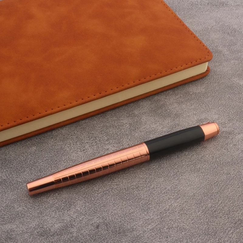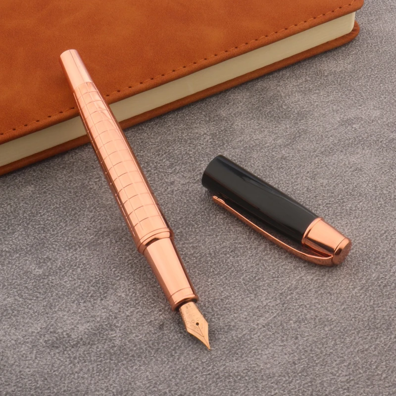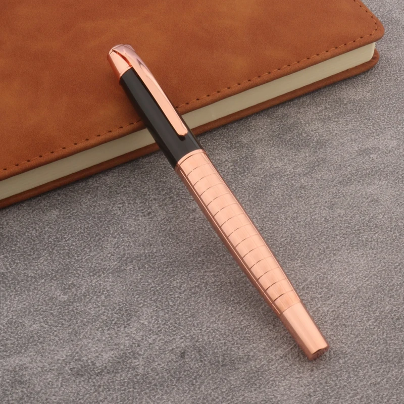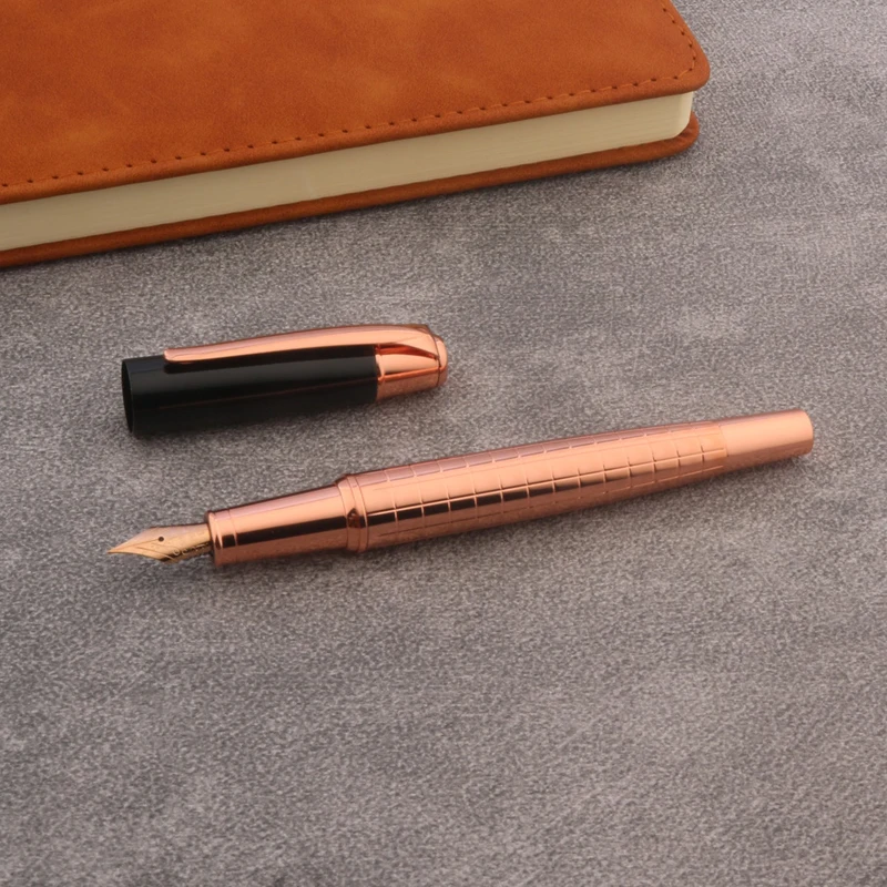 Immerse yourself in the luxurious feel and refined design of this stunning fountain pen by Chouxiongluwei. Crafted with a sleek, cylindrical metal body finished in a warm rose gold tone, it exudes elegance perfect for high-end correspondence or personal writing. The pen features evenly spaced, horizontal indentations along its body, offering a subtle ribbed texture that enhances grip while adding visual interest. Its glossy, smooth cap matches the polished body, creating a cohesive and sophisticated appearance. The exposed gold-colored nib showcases fine craftsmanship, with options for EF, F, or M sizes, including a precise 0.5mm tip. This pen is an ideal accessory for professionals and enthusiasts who value style and performance in every stroke.