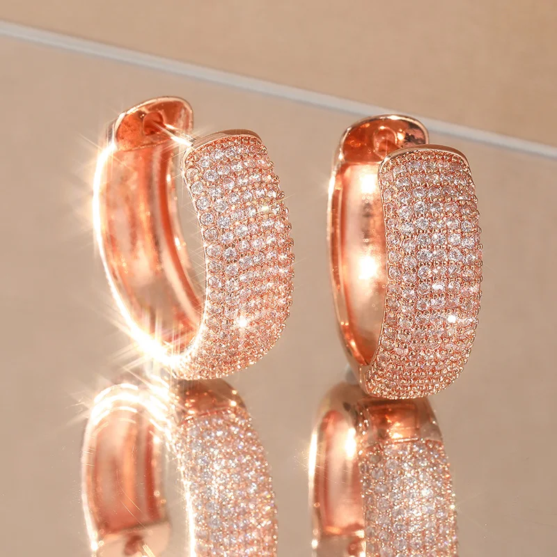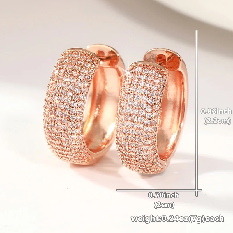 Step into sophistication with this stunning pair of this elegant rose gold hoop earrings. Crafted from high-quality copper alloy, these earrings boast a radiant rose gold finish that complements any style. The dense encrustation of sparkling cubic zirconia stones on the outer surface creates a captivating pavé-like shimmer, perfect for elevating your look. With their bold, rounded profile and trendy design, these earrings are ideal for various occasions, from parties and weddings to everyday chic wear. Their smooth polished interior ensures comfort, making them an essential piece for your jewelry collection. Experience the luxurious blend of glamour and elegance that defines this beautiful accessory.