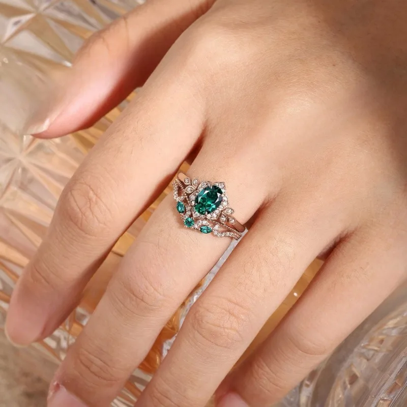 Imagine elevating your style with this stunning women's ring set, featuring a warm rose gold finish that complements all skin tones. The set's delicate bands are intricately detailed, adding a touch of sophistication and trendiness to your look. The centerpiece is a bold, 8mm oval-shaped green zircon stone, expertly set in a prong setting to maximize brilliance. Surrounding it are small, clear white zircon stones arranged in a floral or geometric pattern, creating an ornate, eye-catching frame. Additional petite green marquise-cut stones are spaced along the bands, enhancing the floral-inspired motif. Whether you’re dressing for parties or special gatherings, this versatile set offers a perfect blend of elegance, fashion, and festive charm that you’ll love wearing time and again.