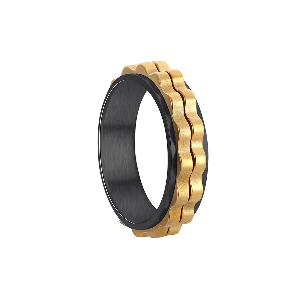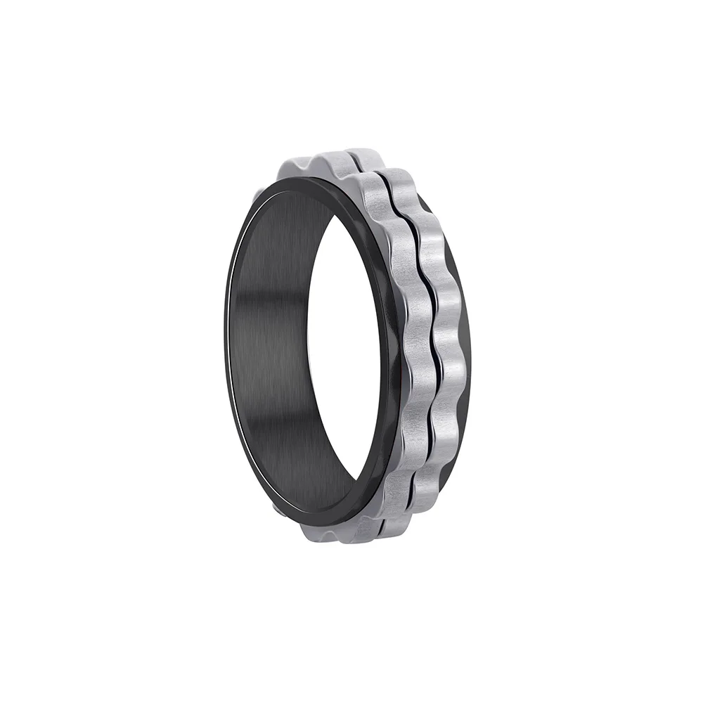 - Features a 6mm wide band with a distinctive, wavy gear-like pattern around the circumference, adding an industrial, neo-Gothic appeal to contemporary looks.