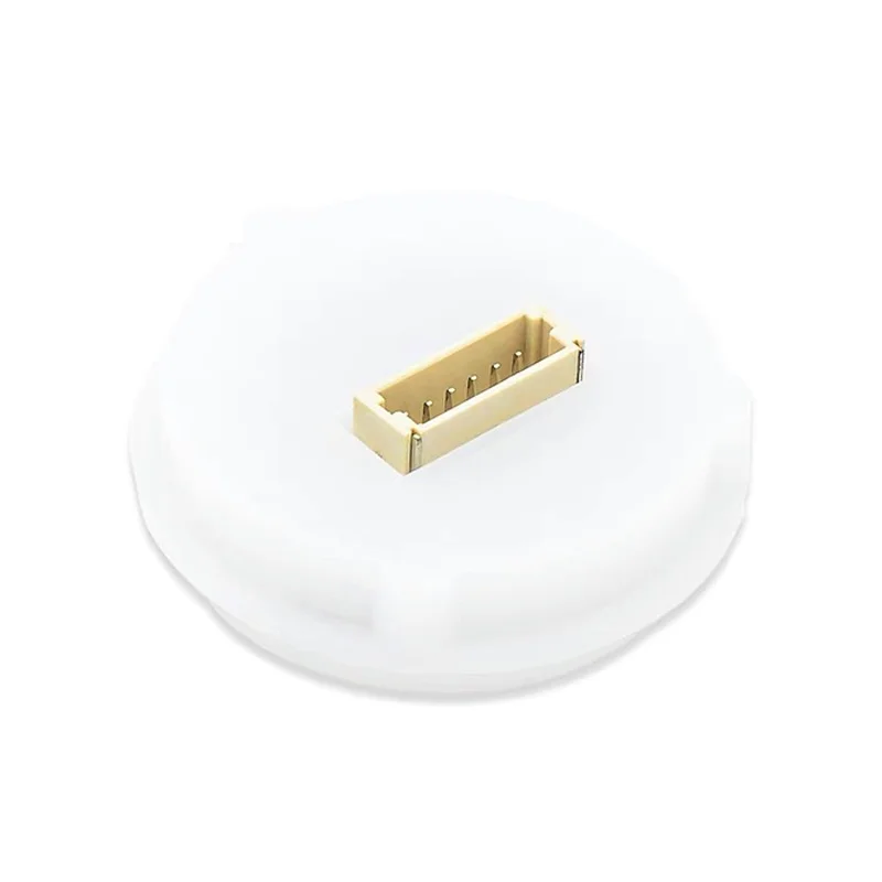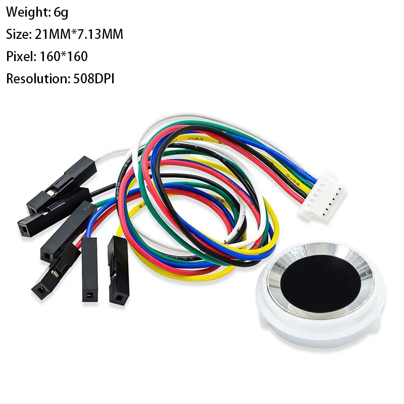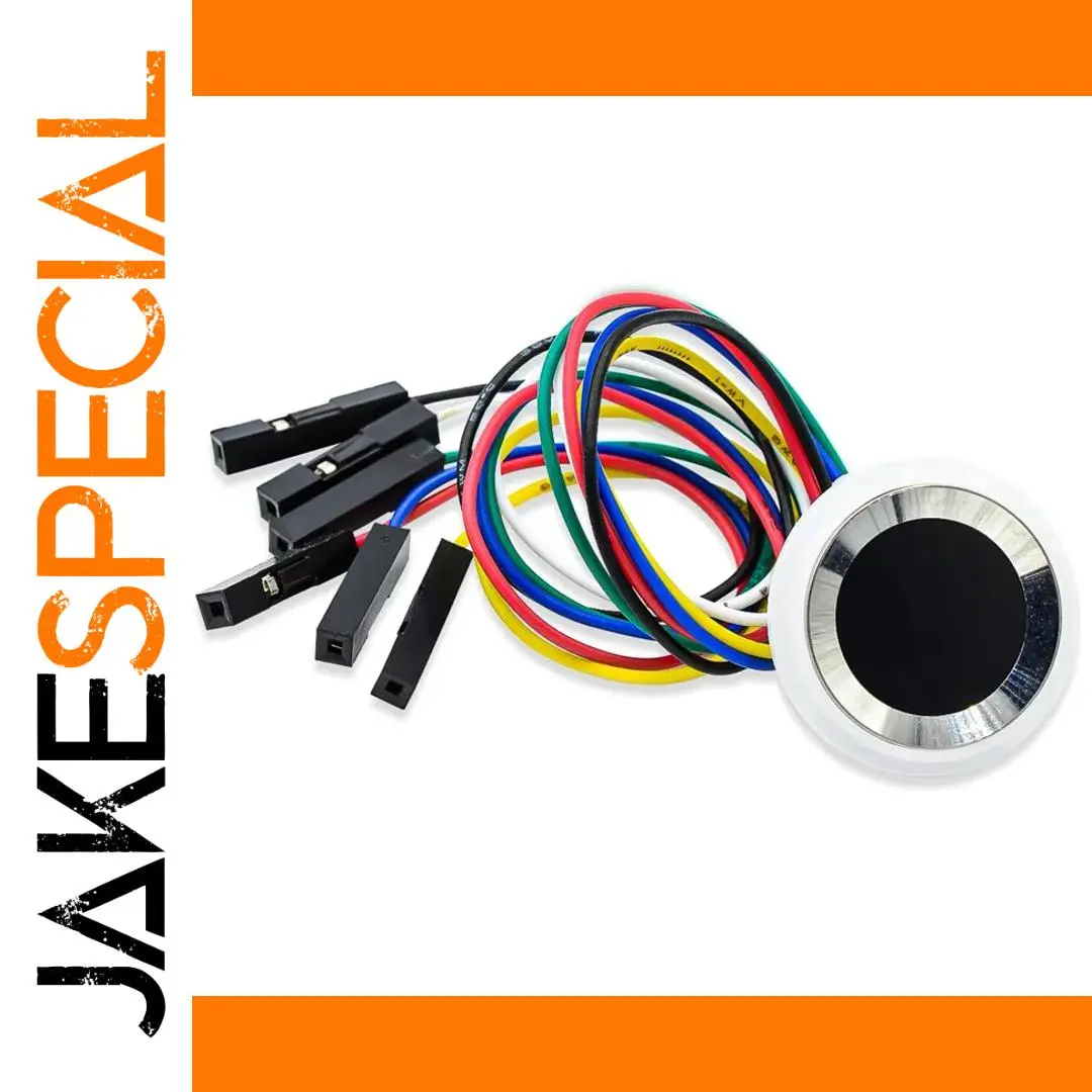 Enhance your embedded systems with this sleek, round semiconductor capacitive fingerprint sensor module featuring UART communication. It has a polished metallic silver outer rim and a dark sensing surface, framed by a subtle bezel, offering a modern and sophisticated look. The module is customizable, operates at a standard supply voltage, and includes vibrant, multi-colored flexible wiring with black rectangular connector adapters for easy integration. Designed for reliable fingerprint recognition, it is suitable for various applications, ensuring secure access and efficient identification in your projects. Perfect for hobbyists and professionals seeking a high-quality, stylish biometric component.