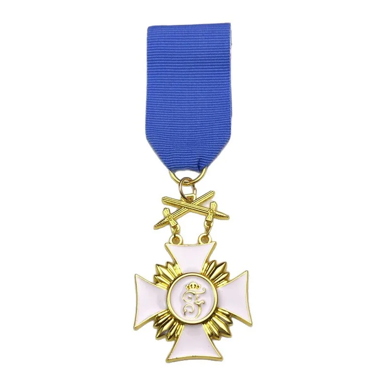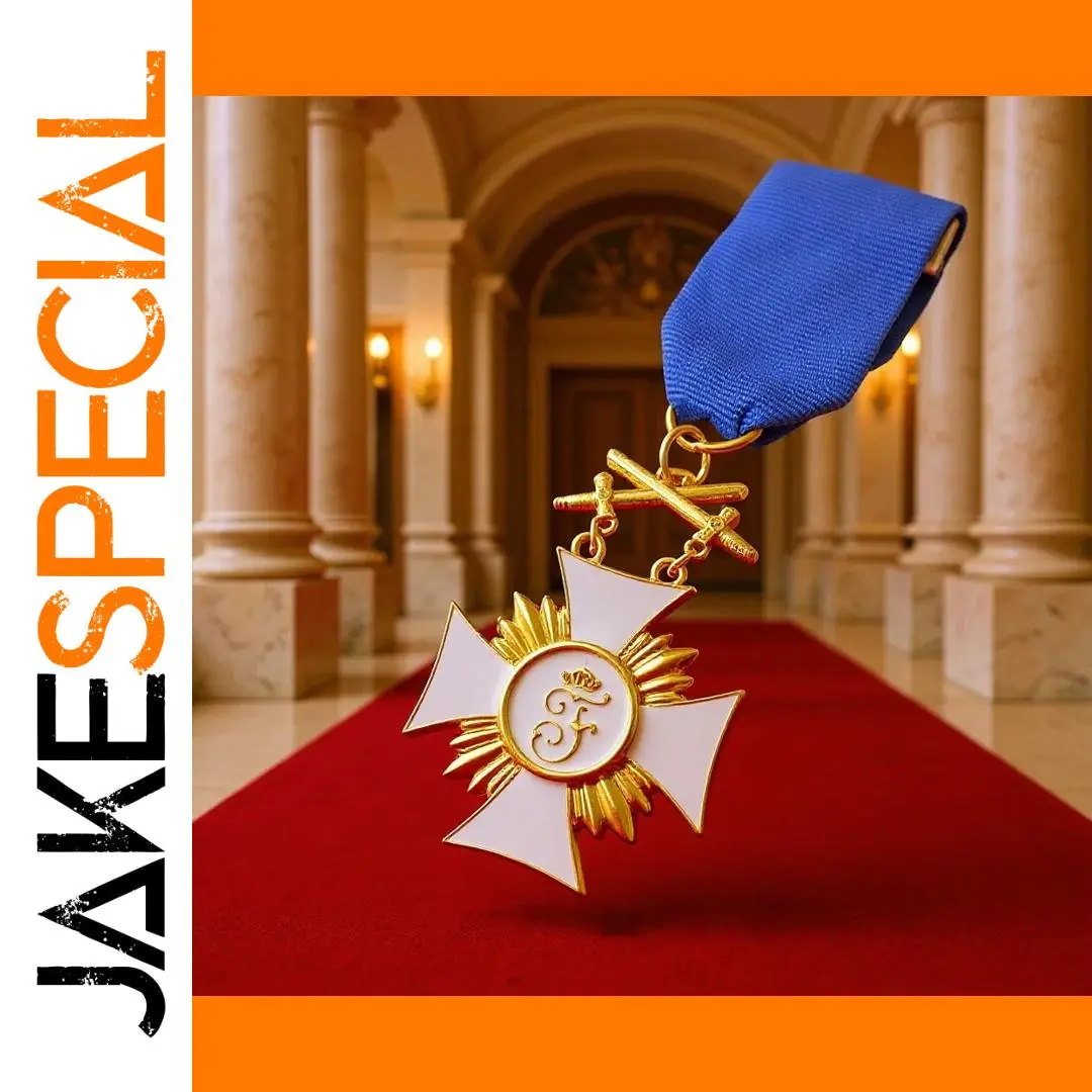 This elegant decorative medal features a gold-plated Maltese-style cross with white enamel fill, crowned monogram “F”, and radiant sunburst rays, measuring approximately 50mm tall by 35mm wide. A crossed tools charm above the medal symbolizes valor and military tradition, while the durable zinc alloy construction ensures long-lasting quality. It comes with a luxurious royal blue satin ribbon for wearing or display and includes a secure chain and clasp for versatile attachment as a lapel pin, wall decoration, or collectible tribute, making it a perfect addition for collectors, history enthusiasts, or those seeking a regal, symbolic accessory.