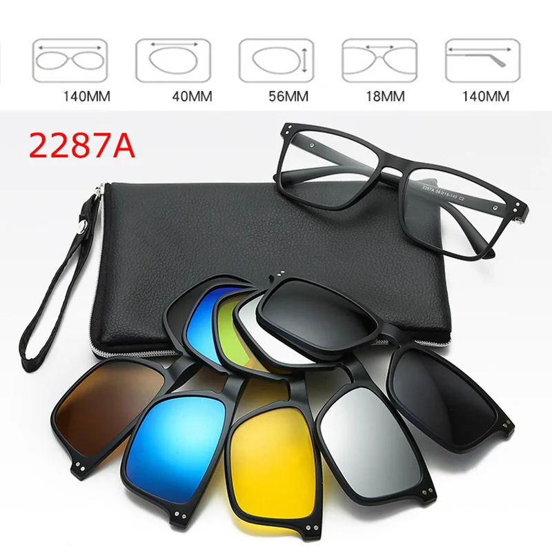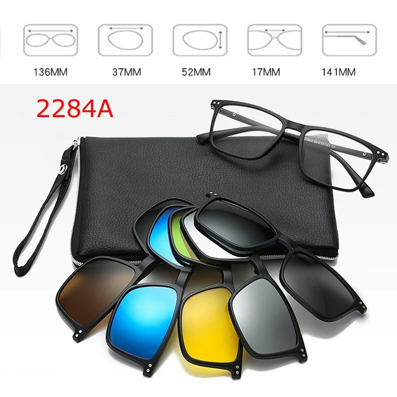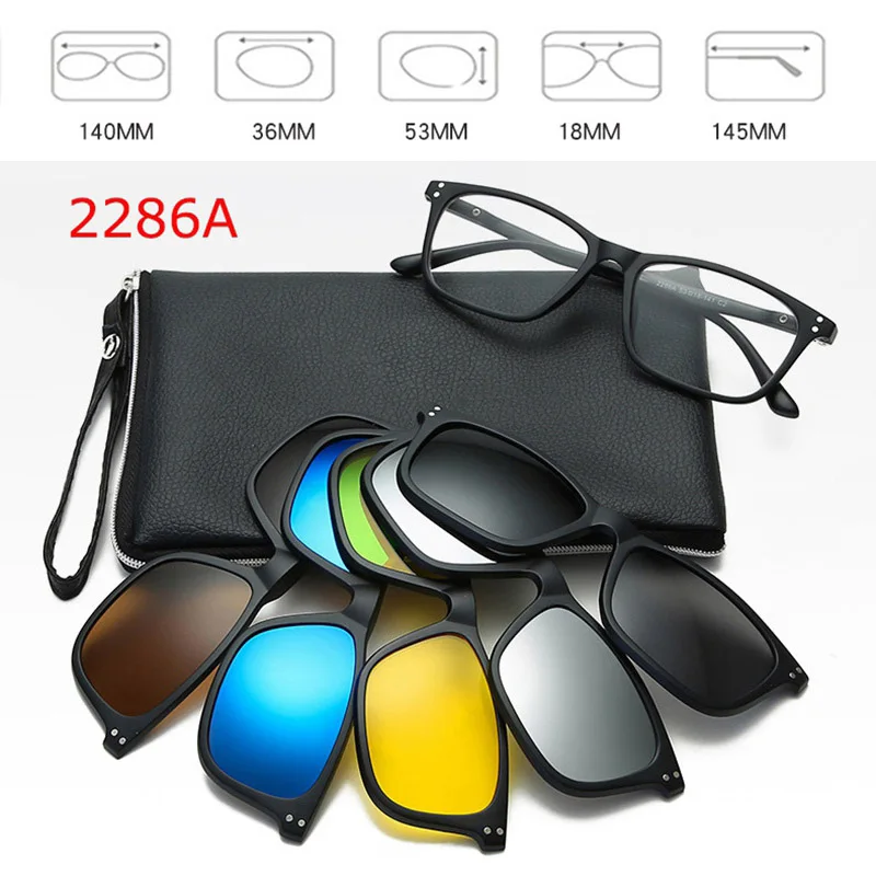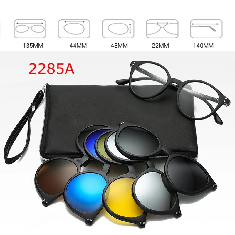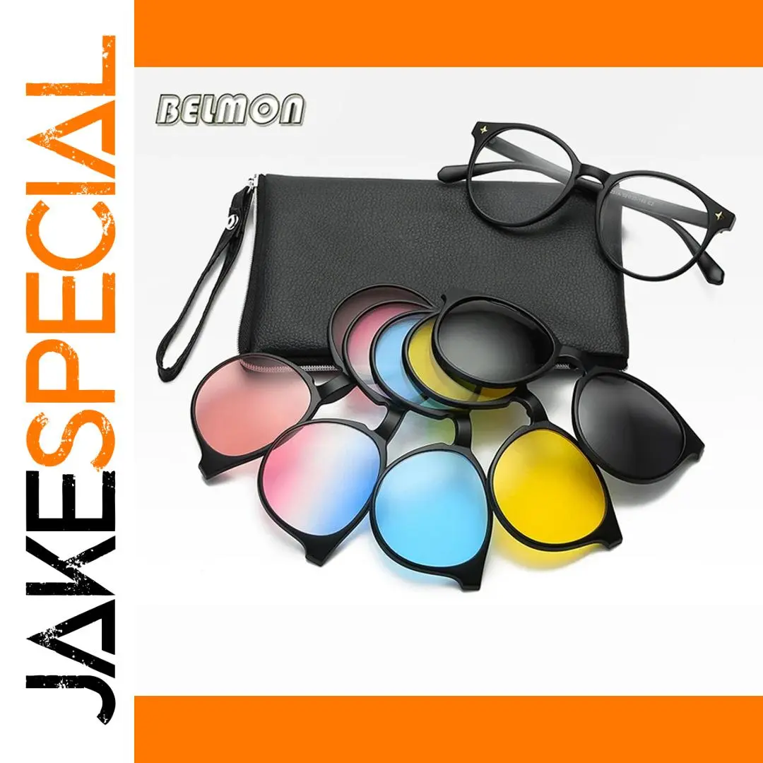 - Includes five polarized magnetic clip-on sunglasses with oval shapes, black borders, and vibrant color options—pink, blue, green, yellow, and gray—for customizable sun protection.
