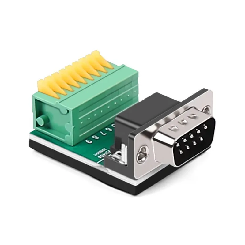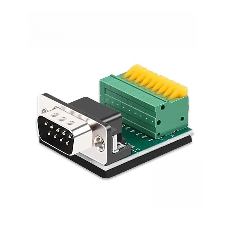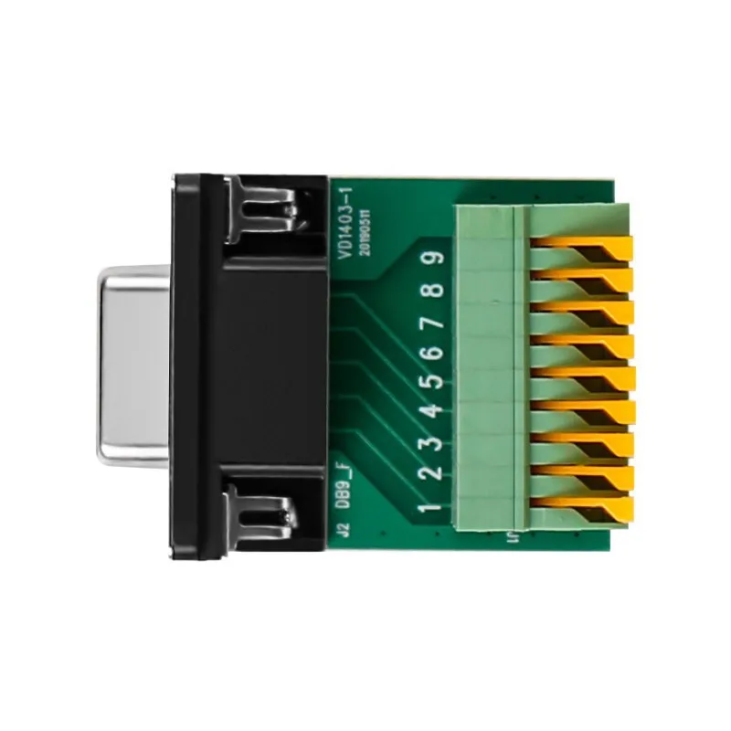 Create a seamless connection for your serial communication needs with this this versatile RS232/422/485 breakout board. Designed for durability and ease of use, it features a compact green PCB that combines industrial style with functional efficiency. The prominent green terminal block, accented with bright yellow plastic caps shaped like small cones or wings, ensures secure wire connections. Opposite the terminal, a sleek metallic DB9 connector (either male or female) with rounded corners and secure screws offers robustness and precise alignment. White silkscreen markings add a clean, technical look while guiding wiring. Suitable for professional and hobbyist projects, this board simplifies integration into industrial equipment, control systems, or custom electronics, providing reliable serial communication at various voltages.