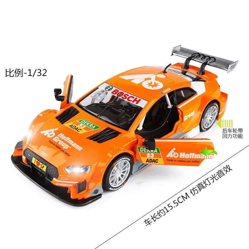 Step into the world of luxury racing with this meticulously crafted 1:32 scale diecast model of the RS5 DTM. Designed for the discerning enthusiast, it boasts a sleek black and gray color scheme enhanced by vibrant decals and sponsor logos. Experience the thrill as the model comes to life with exciting sound and light effects, all powered by a convenient button battery. With its precise details, from the striking grille to the adjustable rear spoiler, this diecast model captures the essence of high-performance motorsport, making it an exquisite addition to any collection. Delight in the artistry and craftsmanship with every glance.