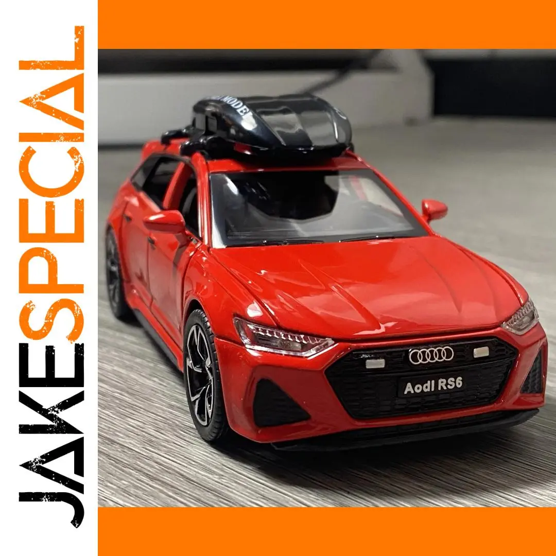 This detailed 1:32 scale diecast model of the RS6 Quattro Avant Wagon features a durable metal alloy construction with a glossy, metallic red finish that highlights its sporty design. The model accurately captures the aggressive front grille, angular headlights, sharp side mirrors, and transparent windows revealing a detailed interior. Its multi-spoke black rims with realistic tires, combined with a shiny black roof box, enhance its high-performance appeal. Equipped with functional light and sound effects powered by easily accessible standard batteries, this collectible is perfect for automotive enthusiasts and adult collectors seeking a vivid, interactive miniature of the iconic RS6 Quattro Avant.