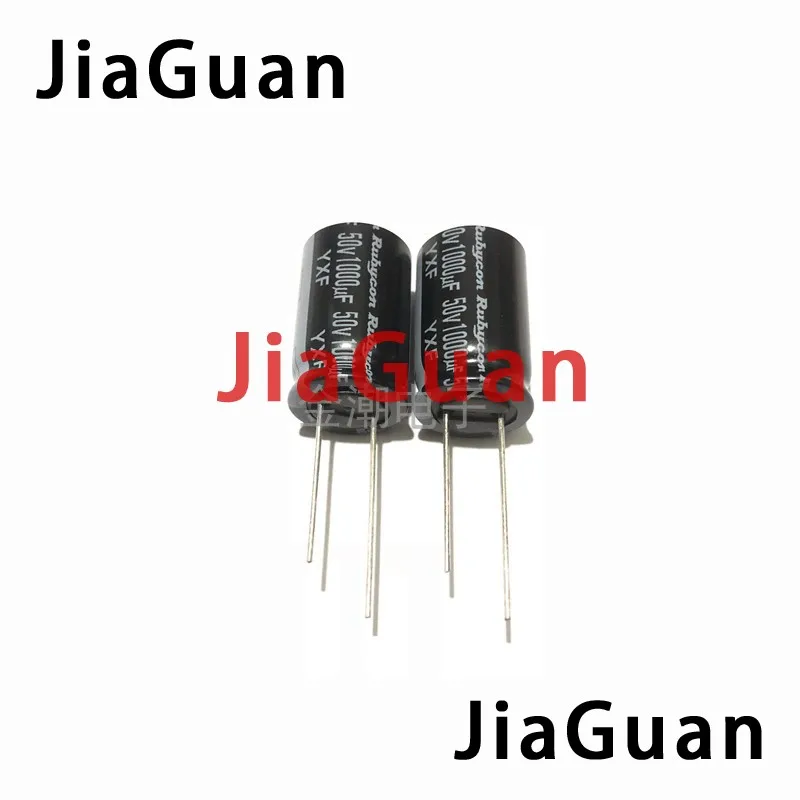 Experience reliable performance with this set of ten Rubycon YXF electrolytic capacitors, designed for high-frequency applications. Each capacitor features a sleek black cylindrical body with a glossy surface that reflects light subtly, emphasizing its polished finish. The white text printed around the body clearly displays the technical specifications: 50V voltage rating, 1000µF capacitance, series YXF, and origin Japan. With dimensions of 16mm in diameter and 25mm in height, these capacitors provide a compact yet durable solution for your electronic or speaker circuit needs. Their long lifespan, low resistance, and operating temperature of up to 105°C ensure longevity and consistent performance, making installation straightforward and worry-free for your projects.