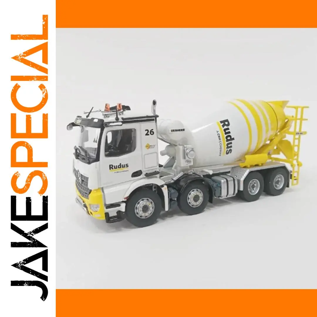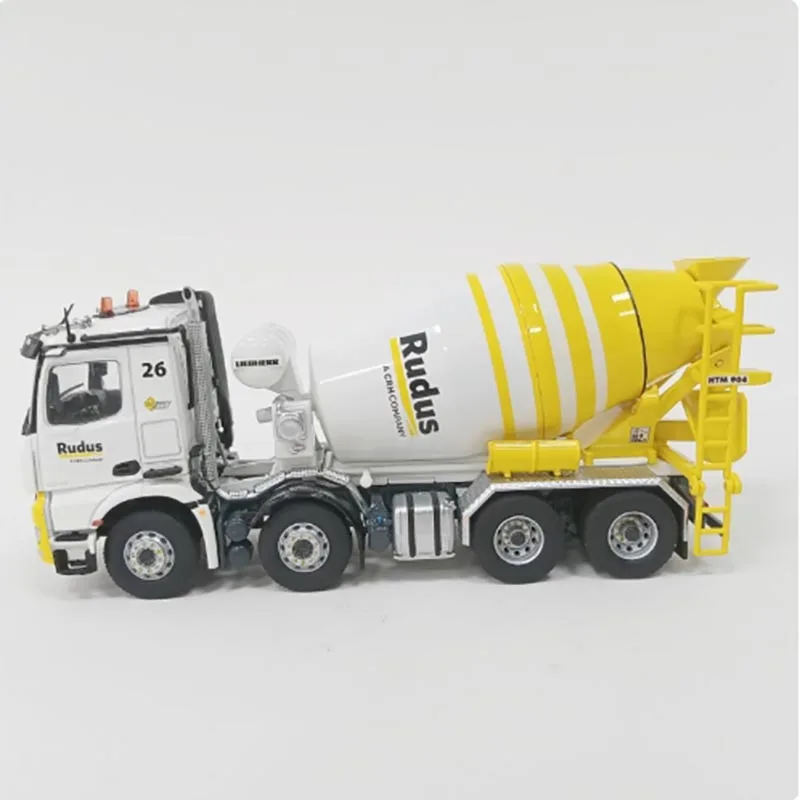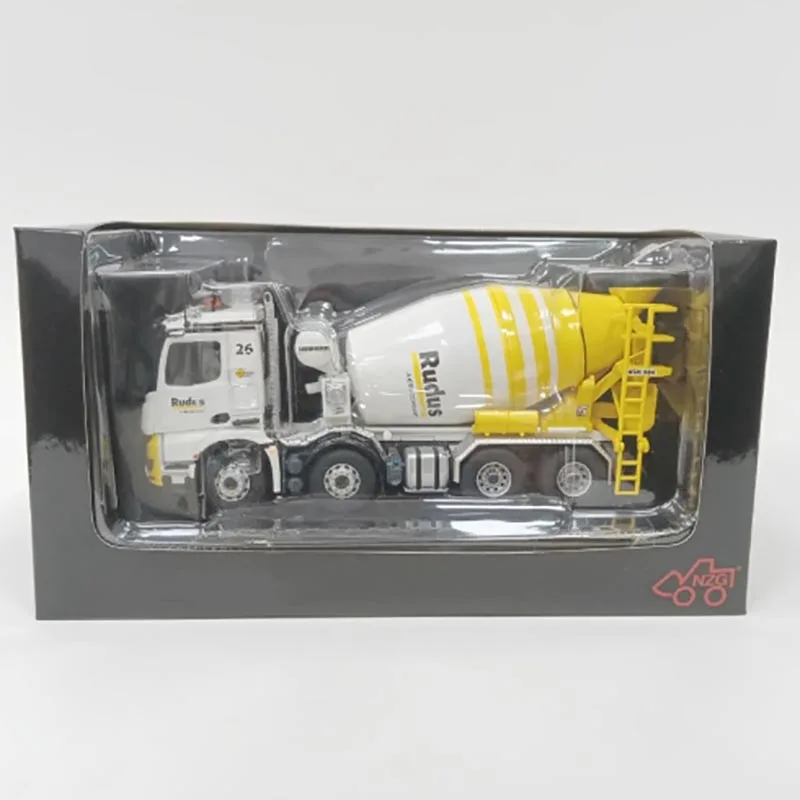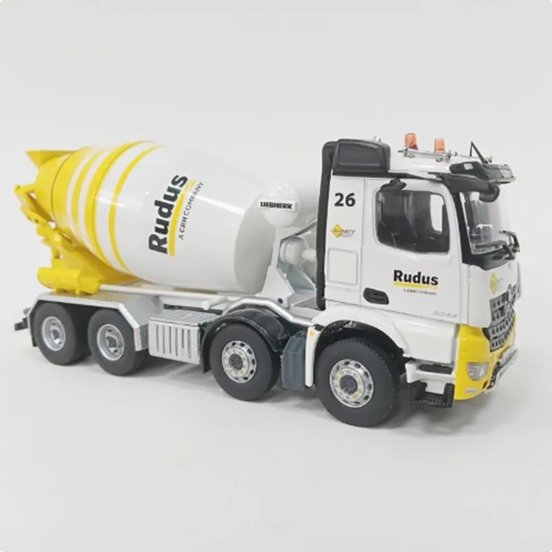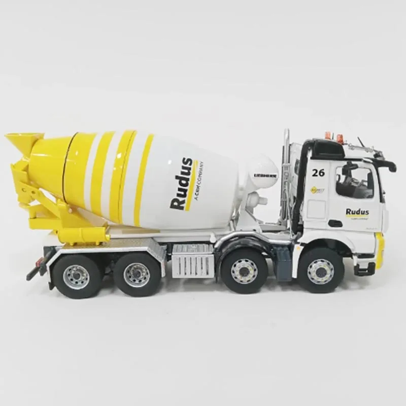 Immerse yourself in the industrial charm of this highly detailed miniature of the Rudus cement mixer truck, scaled at 1/50. Crafted from alloy and plastic, this model showcases an authentic design with a sleek, predominantly white cab accented by black and yellow components. The large, cylindrical mixing drum features bold yellow stripes and black logos, creating visual contrast and realism. The yellow bumper adds a vibrant touch, while the black wheels with silver hubs, detailed mirrors, lights, and exhaust pipes enhance the lifelike appearance. Perfect for collectors or enthusiasts, this static ornament captures the gritty elegance of heavy-duty construction machinery. Its meticulous craftsmanship makes it a standout display piece for any collection or decor setup.