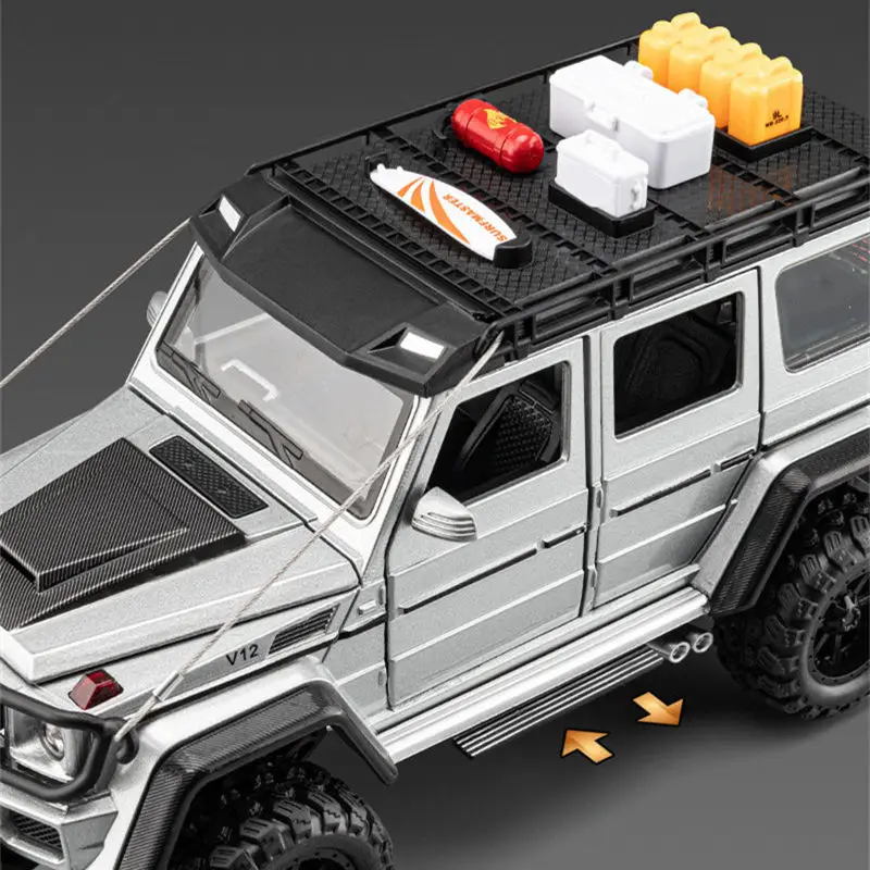 Imagine holding a detailed replica of a rugged off-road vehicle with a striking design, capturing every aspect of an adventurous SUV. Made from durable alloy and plastic, this high-quality model showcases an aggressive, angular look with prominent wheel arches, a bold black grille, a sturdy bumper with towing hook, and textured knobby tires. The hood features a black raised vent, while roof accessories include a white storage box, red tool, and yellow emergency light, with wire antennae extending from the roof. Available in modified blue, modified black, gray, blue, black, and modified gray, this vehicle boasts realistic sound and light functions, bringing an exciting, dynamic touch to your collection or display. Enhance your space with this beautifully crafted model today.