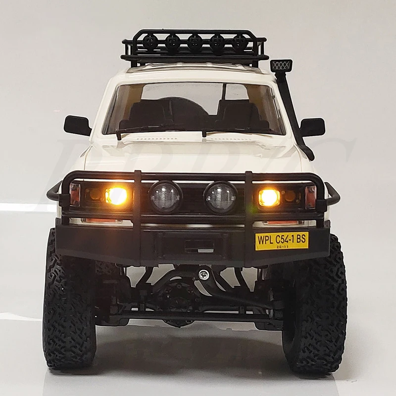 Experience the thrill of off-road crawling with this highly detailed, rugged 1:16 scale RC vehicle. Its matte white finish and realistic design mimic a full-sized pickup truck, making it perfect for outdoor adventures. The sturdy exterior features a black grille guard, bumper, and detailed structural components such as door outlines, handles, and wheel arches. The large 70mm tires with deep treads provide excellent ground clearance, enabling you to conquer challenging terrains. Roof accessories like a black rack, lamps, and a rear ladder add a touch of realism and versatility. Designed for durability and high performance, this RC vehicle offers precise steering and full mobility, allowing you to navigate obstacles effortlessly. Whether you're a collector or a hobbyist, it promises endless outdoor fun.