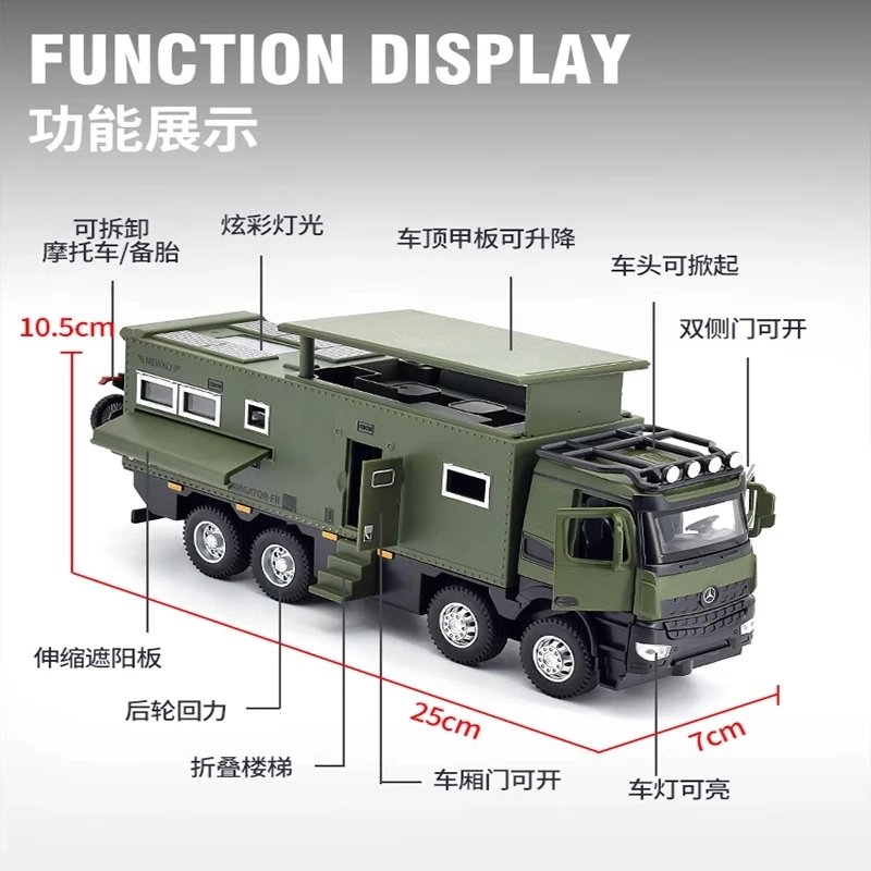 Step into the world of adventure and exploration with this highly detailed 1:24 scale diecast model of the Nomadism Navigator Benz Arocs 8X8. Crafted from durable alloy and plastic, this model boasts a rugged military-inspired design, finished in a matte olive green that highlights its off-road capability. The comprehensive detailing includes a boxy, sturdy cab with clear windows, prominent side mirrors, and a front adorned with a Mercedes-Benz logo, white headlamps, and detailed bumpers. The cargo area features realistic small windows and silver trims, perfectly capturing an expedition-ready vibe. With shining silver wheels and detailed tire treads, this model radiates realism and robustness. Whether as a collector’s piece or a display item for off-road enthusiasts, this model embodies power and adventure.