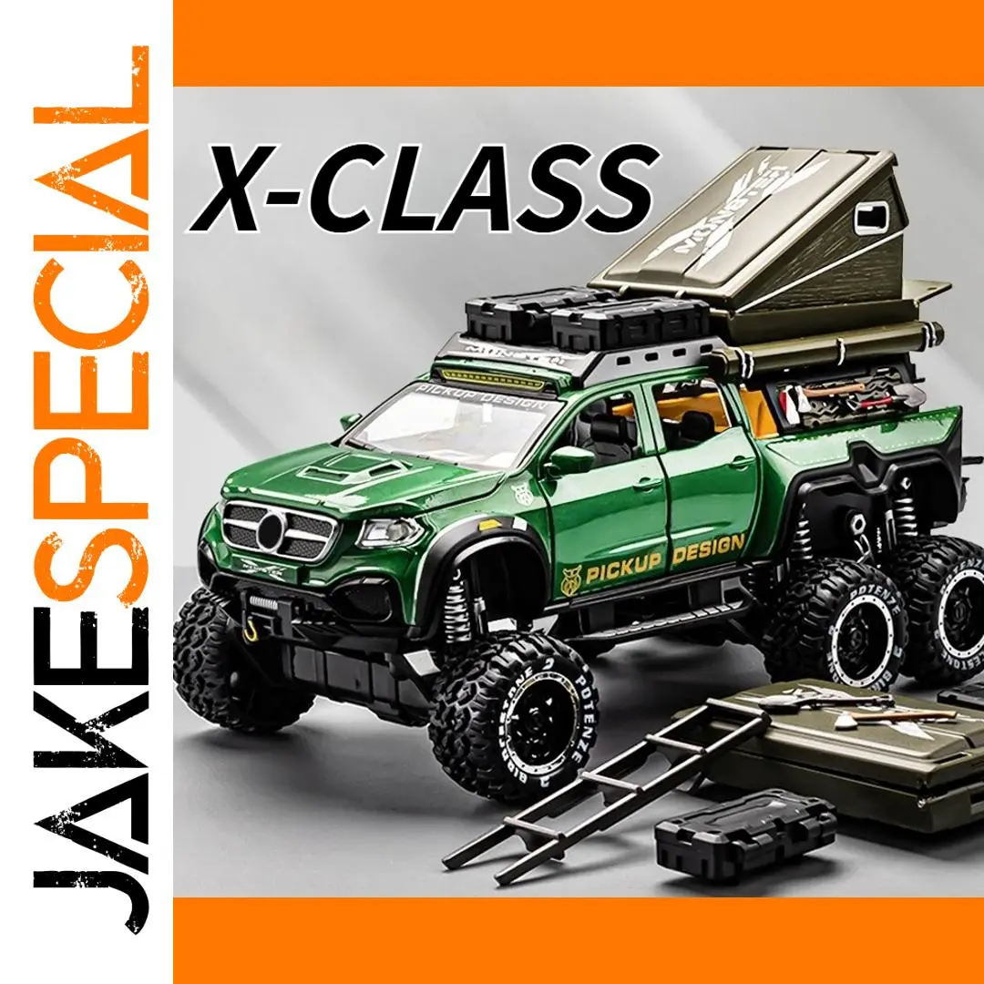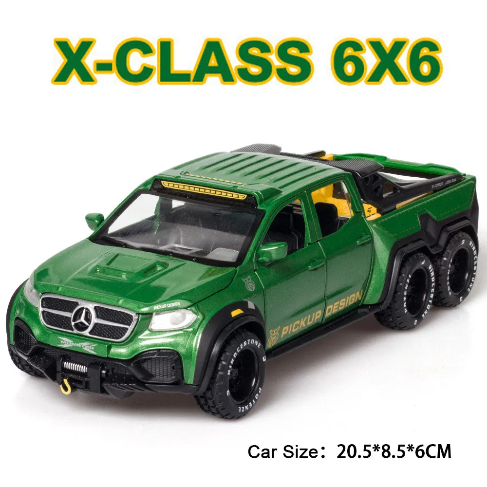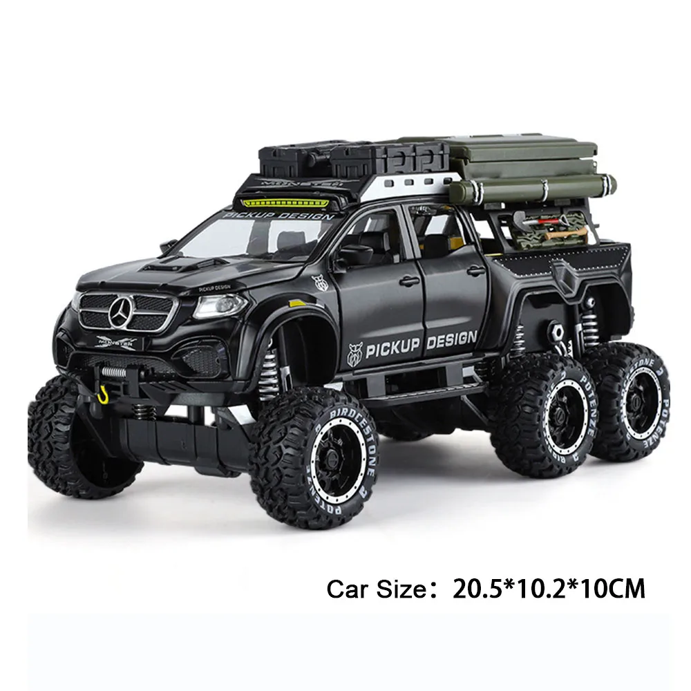 Imagine owning this highly detailed, high-simulation 1:28 scale diecast model of a rugged camping and 6×6 off-road vehicle. Crafted from durable metal alloy, plastic chassis, and rubber tires, this model combines realism with playability. Its vibrant green color, contrasted with black accents and bold “PICKUP DESIGN” decals, captures the adventurous spirit of outdoor exploration. The vehicle’s high lift chassis and oversized knobby tires promise stability and durability across rugged terrains. Its realistic features include openable doors, hood, and trunk revealing intricate interior and engine details, while sound and light effects enhance the experience. Perfect for collectors, enthusiasts, and young adventurers alike, this model empowers imaginations and elevate outdoor storytelling.