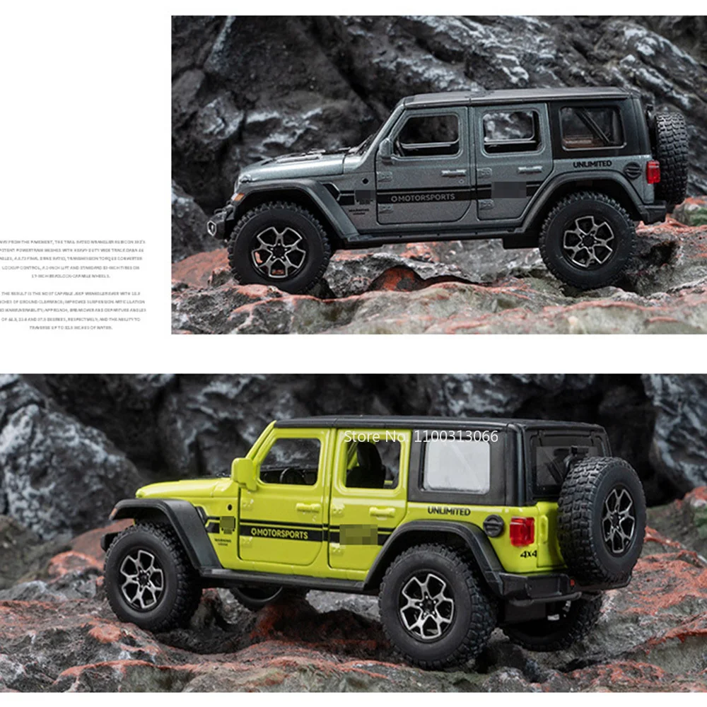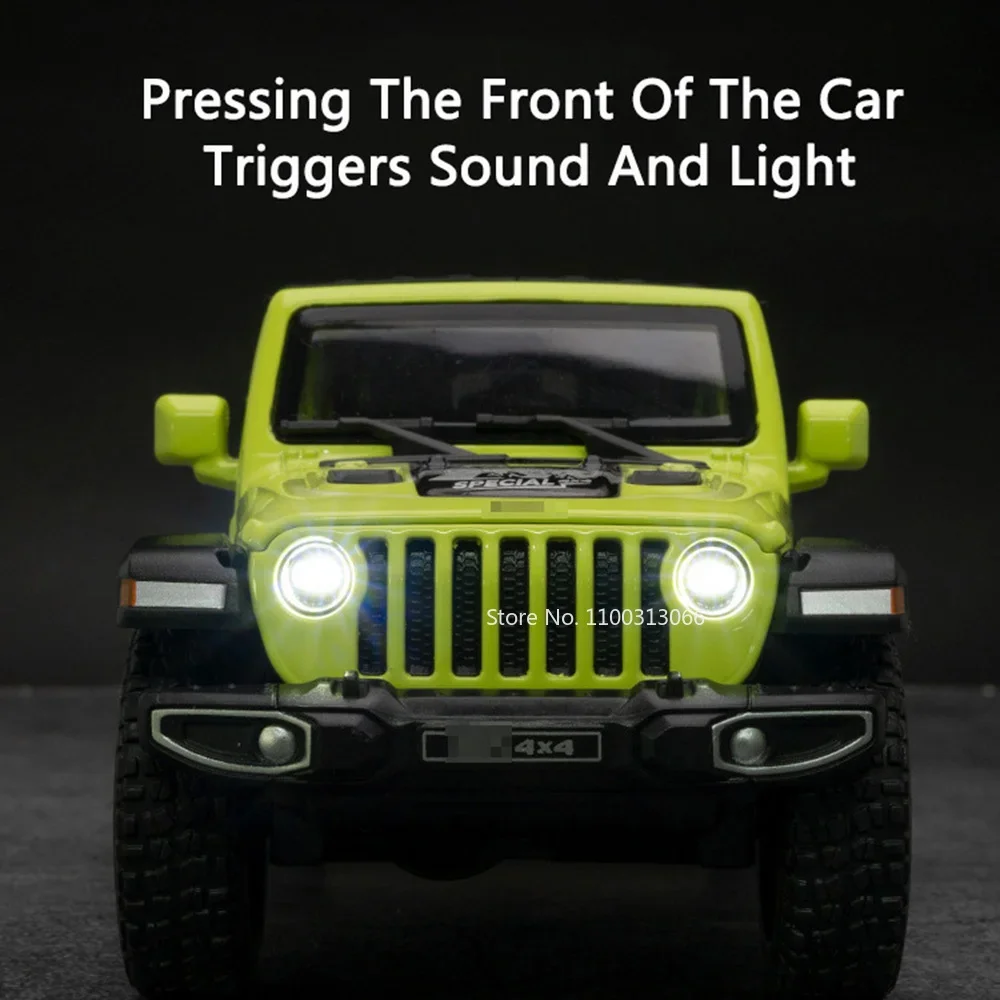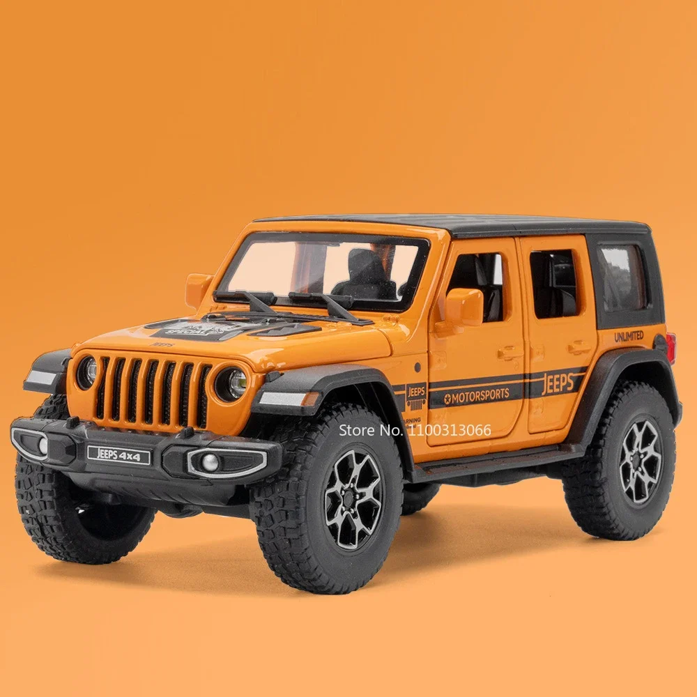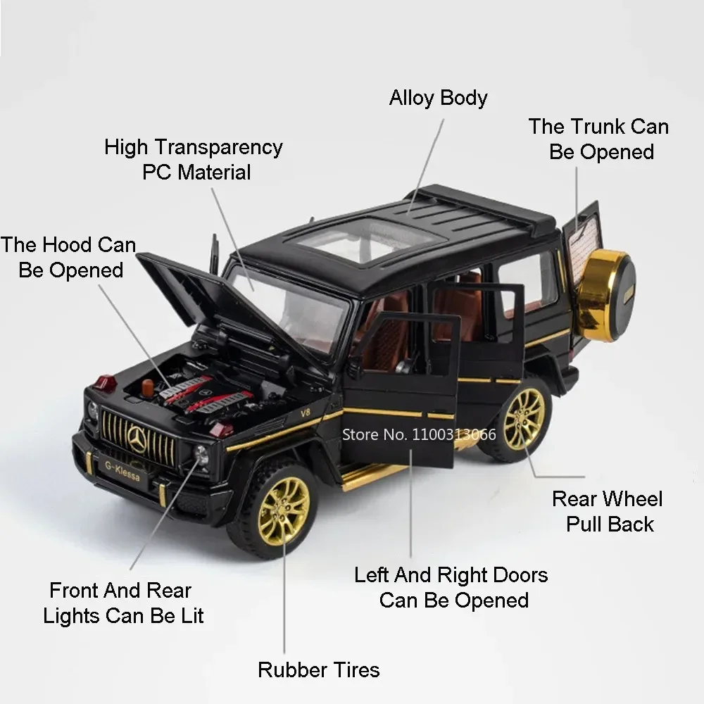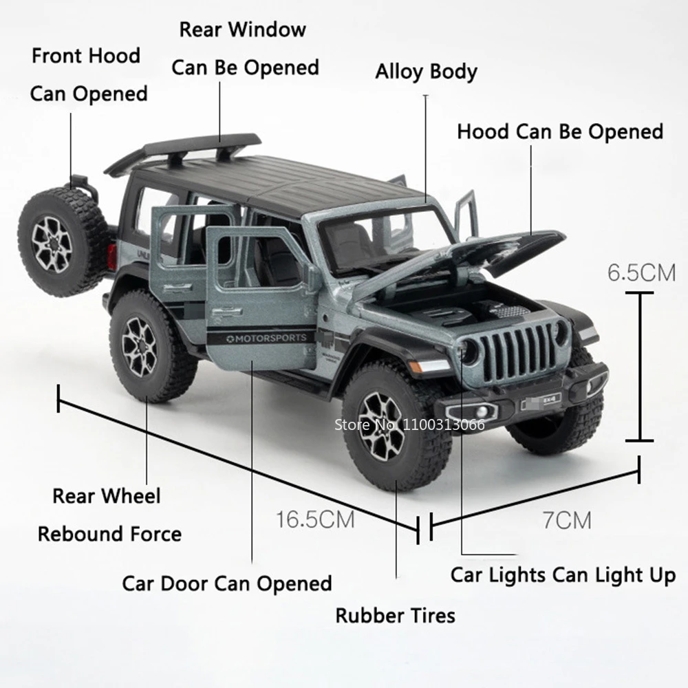 This highly detailed 1:32 scale alloy SUV model features a durable metal body, plastic chassis, and rubber tires, measuring approximately 16.5 x 7 x 6.5 cm for the Wrangler 4×4 and 16.5 x 6.5 x 7 cm for the G63. It boasts openable doors, functional light and sound effects activated by batteries included, and a sleek pull-back mechanism for dynamic movement. Available in vibrant colors including Bright Black, White, Red, Green, Gray, and Orange, this rugged and realistic off-road vehicle is designed for collectors aged 14 and above. Its intricate details, textured surfaces, roof racks, and spare tires make it a striking display piece or functional toy.