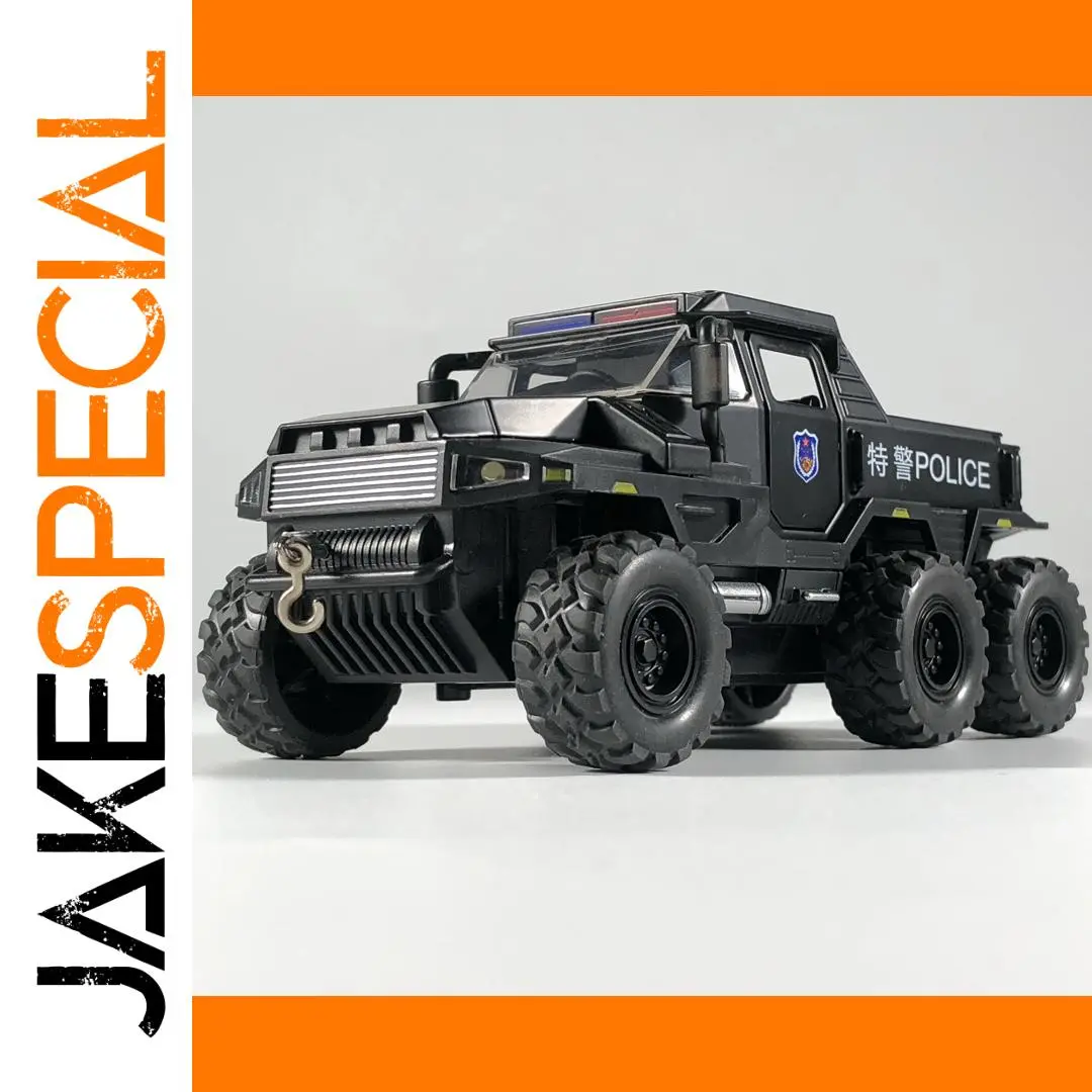 Experience the rugged appeal of this 1:32 scale diecast model car, crafted from durable metal to replicate an off-road, tactical vehicle. Featuring a matte black finish or sleek white option, it boasts detailed angular surfaces, a bold front grille with horizontal slats, and integrated rectangular headlights. The model includes realistic sound and light functions, with roof-mounted red and blue emergency lights accentuating its police-inspired design. Suitable for collectors and enthusiasts aged 14+ and 18+, this robust vehicle captures a commanding, military-inspired aesthetic, making it a striking addition to any collection or display.