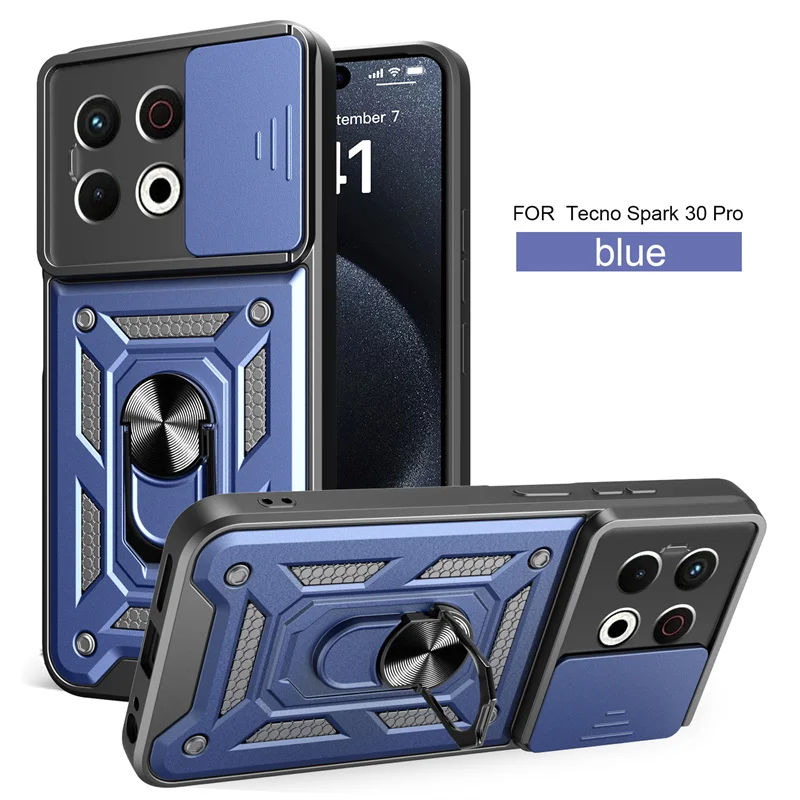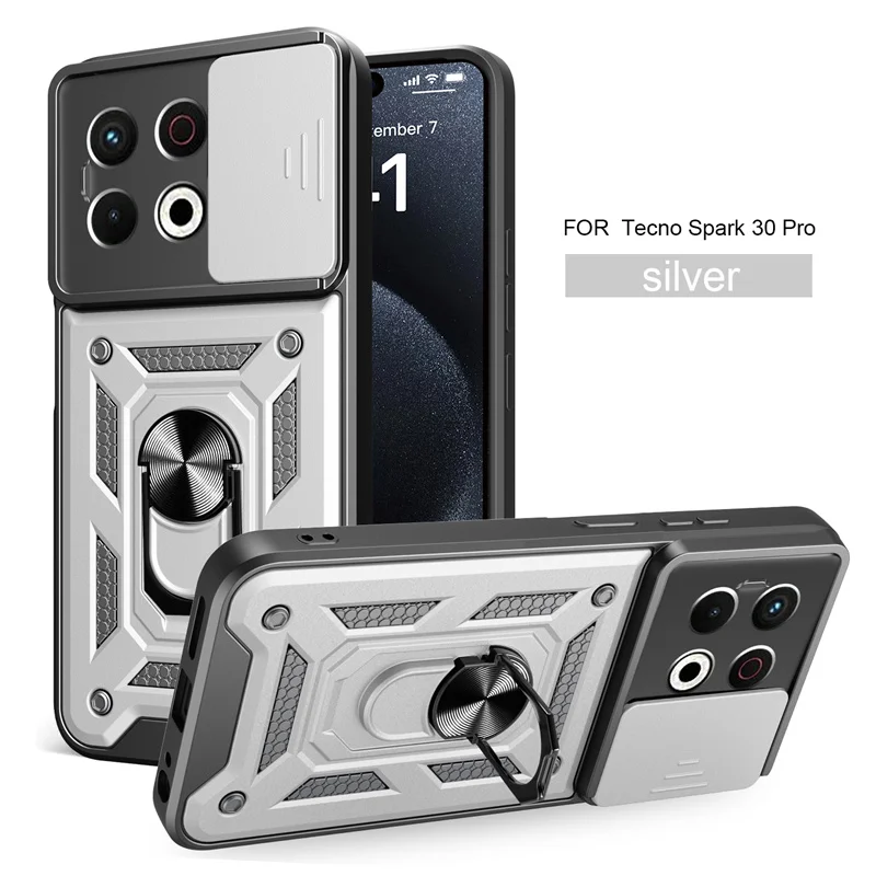Experience superior protection with this rugged, multifunctional case designed specifically for the Tecno Spark 30 Pro. Its dual-layer construction combines durable PC and flexible TPU materials, delivering excellent shock absorption and full coverage. The textured surface features a mix of smooth and patterned areas, ensuring both grip and style. A prominent ring holder on the back functions as a magnetic support bracket and kickstand, allowing hands-free viewing. The push-pull slide camera protector offers effective lens safety by covering the camera when not in use, with a raised edge to prevent scratches. Available in multiple stylish colors, this case blends robust durability with practical features, perfect for active users seeking reliable device safeguarding with a sleek, utilitarian aesthetic.