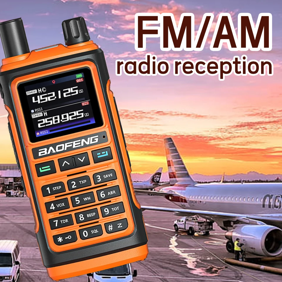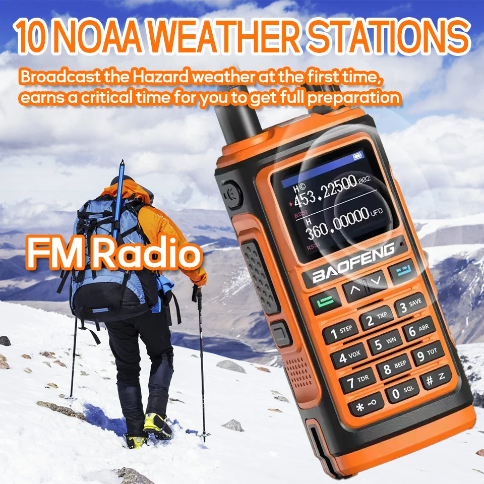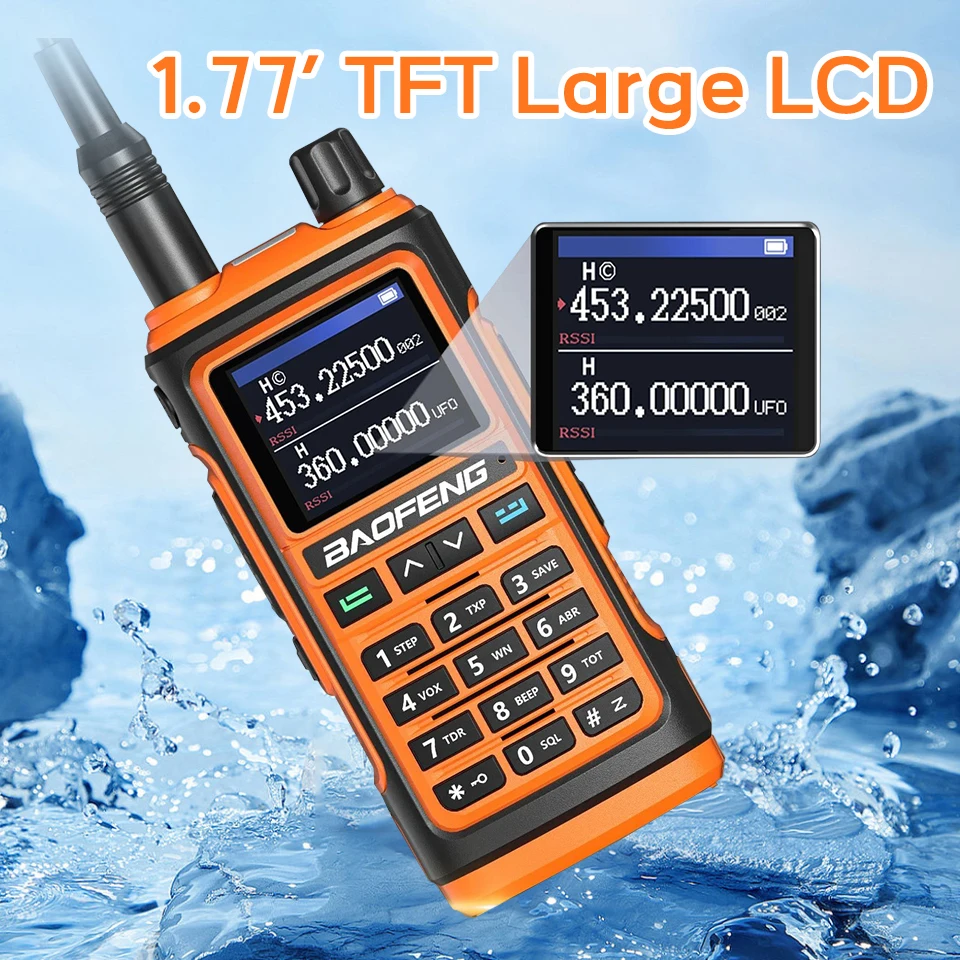 Imagine confidently exploring outdoor terrains with this bold, rugged device that offers reliable communication up to 10 kilometers. Its vibrant orange casing with black accents not only stands out but also resists tough environmental conditions thanks to its IP57 waterproof rating. The high-definition 1.77-inch display provides clear, bright visuals with multiple viewing modes, making operation intuitive even in challenging settings. The physical buttons are designed for easy use while wearing gloves, and the textured grip ensures secure handling. Whether you're hunting, hiking, or working outdoors, this walkie talkie is built to withstand the elements while keeping you connected. Its sleek, compact size fits comfortably in your hand or pocket, making it your perfect outdoor companion.