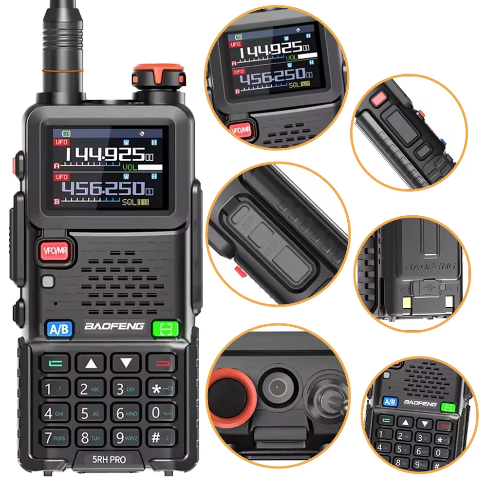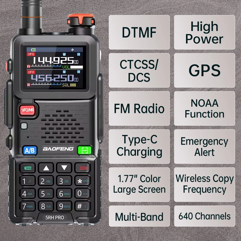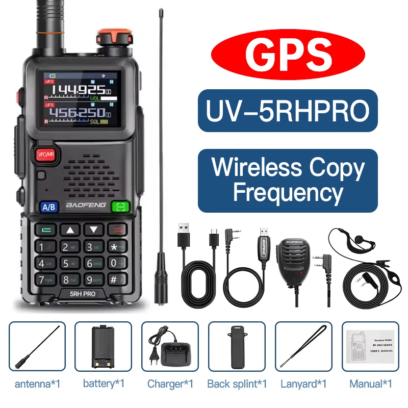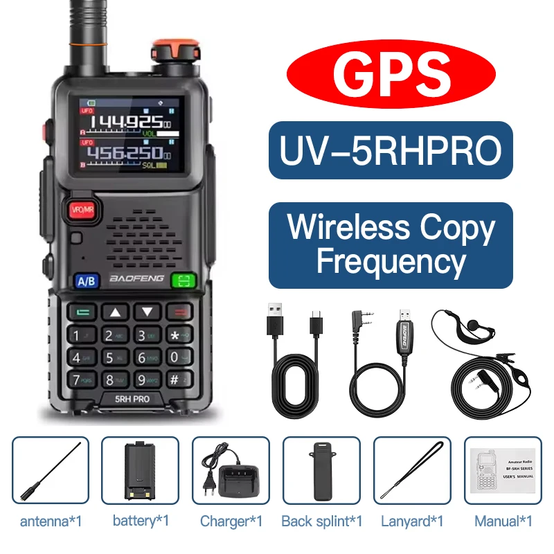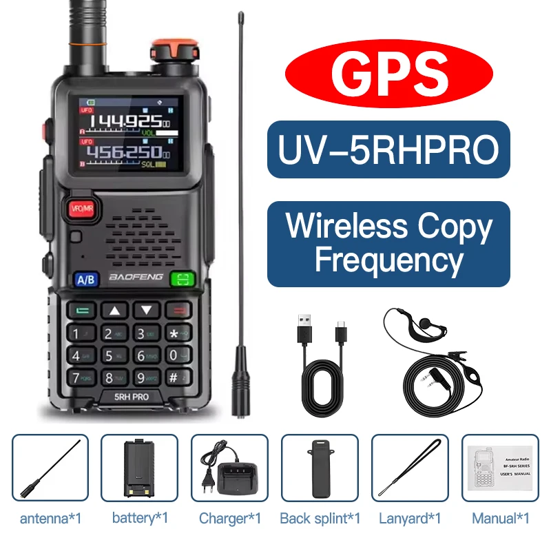 Imagine confidently communicating with this highly versatile Baofeng UV-5RH PRO GPS walkie-talkie. Designed for durability and advanced features, it combines multi-band frequencies, GPS tracking, and long-range voice transmission, making it perfect for outdoor adventures, professional use, or team coordination. Its compact, rugged rectangular shape with rounded edges offers a practical, no-nonsense aesthetic, complemented by its durable plastic exterior and matte finish that minimizes glare. The vibrant color LCD screen displays frequencies, signal strength, and status indicators clearly. Buttons, including a prominent red VFO/MR, navigation keys, and keypad, are intuitively arranged for easy access. The device’s antenna extends from the top, balancing functionality with style. Elevate your communication experience with this reliable, modern tool.