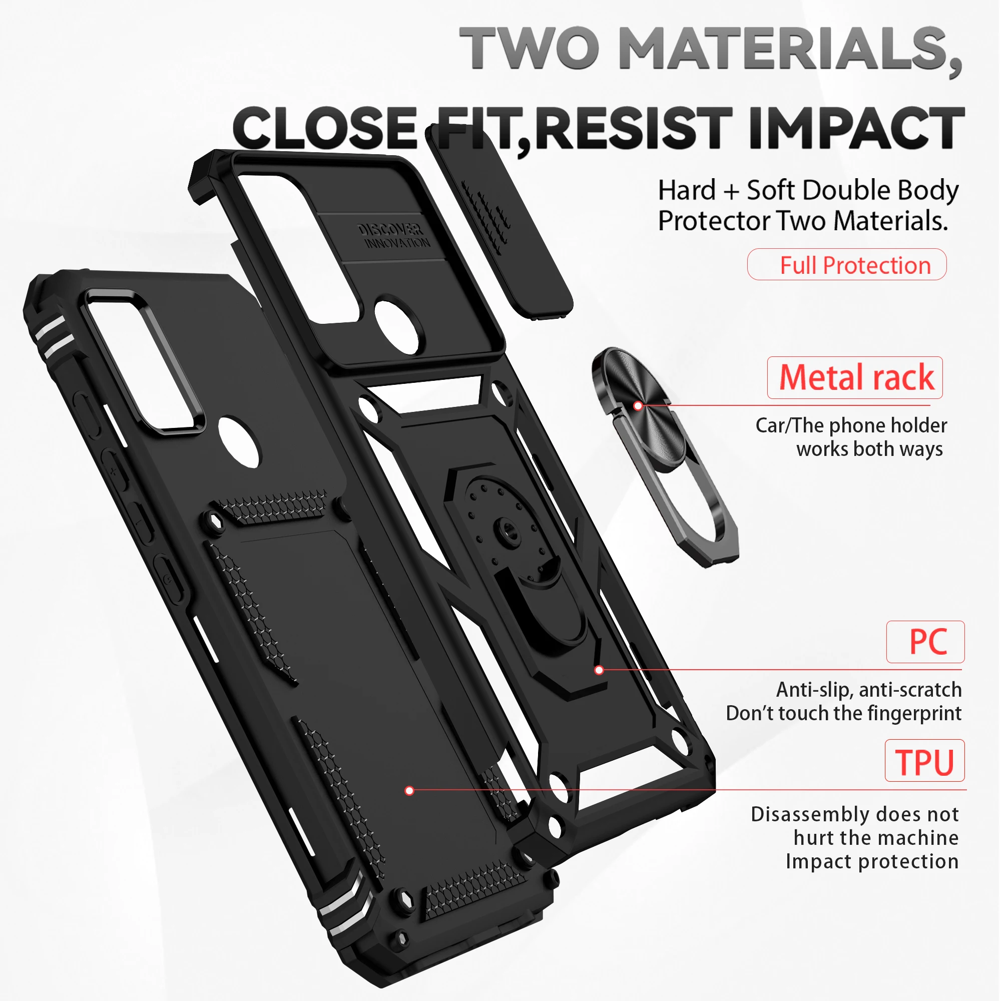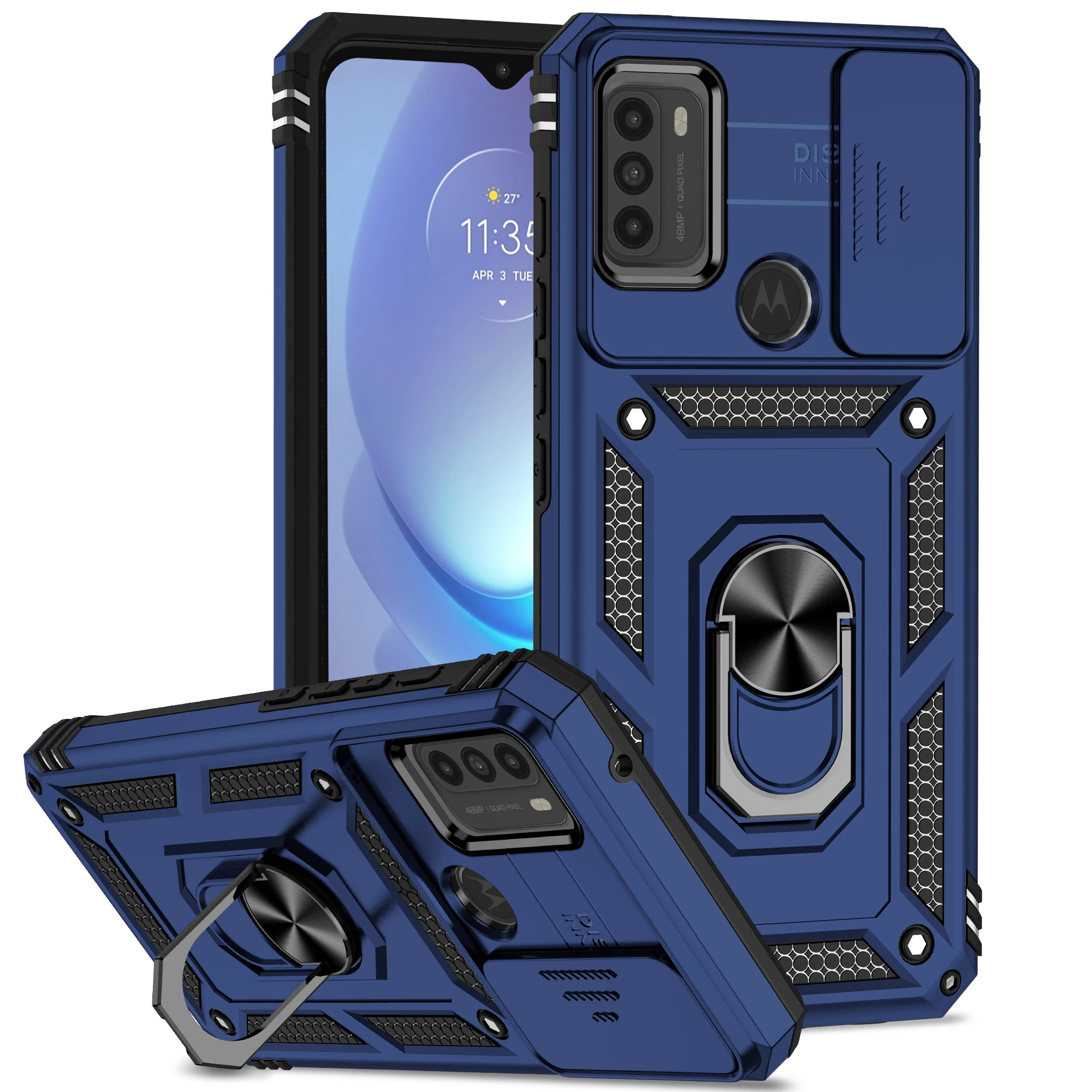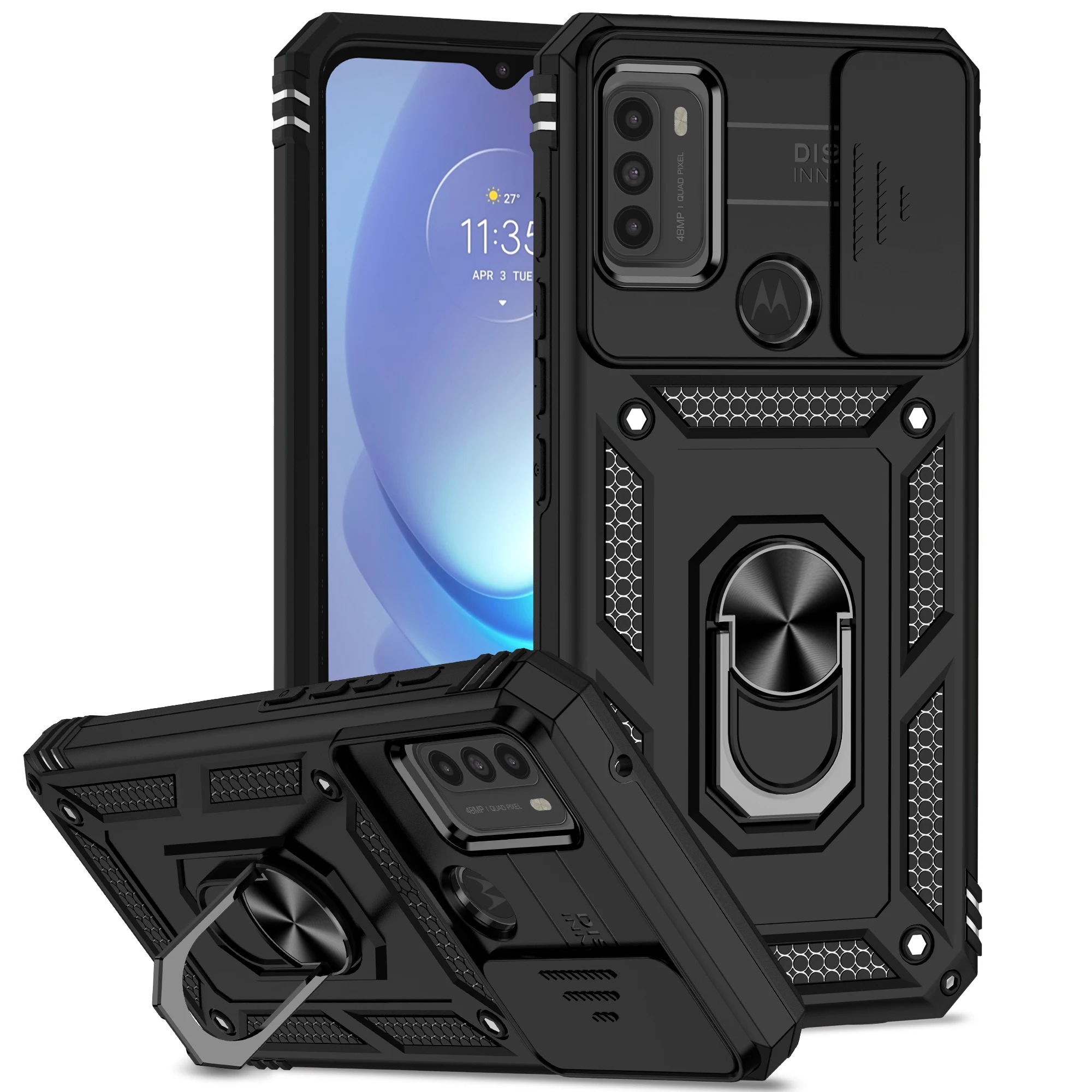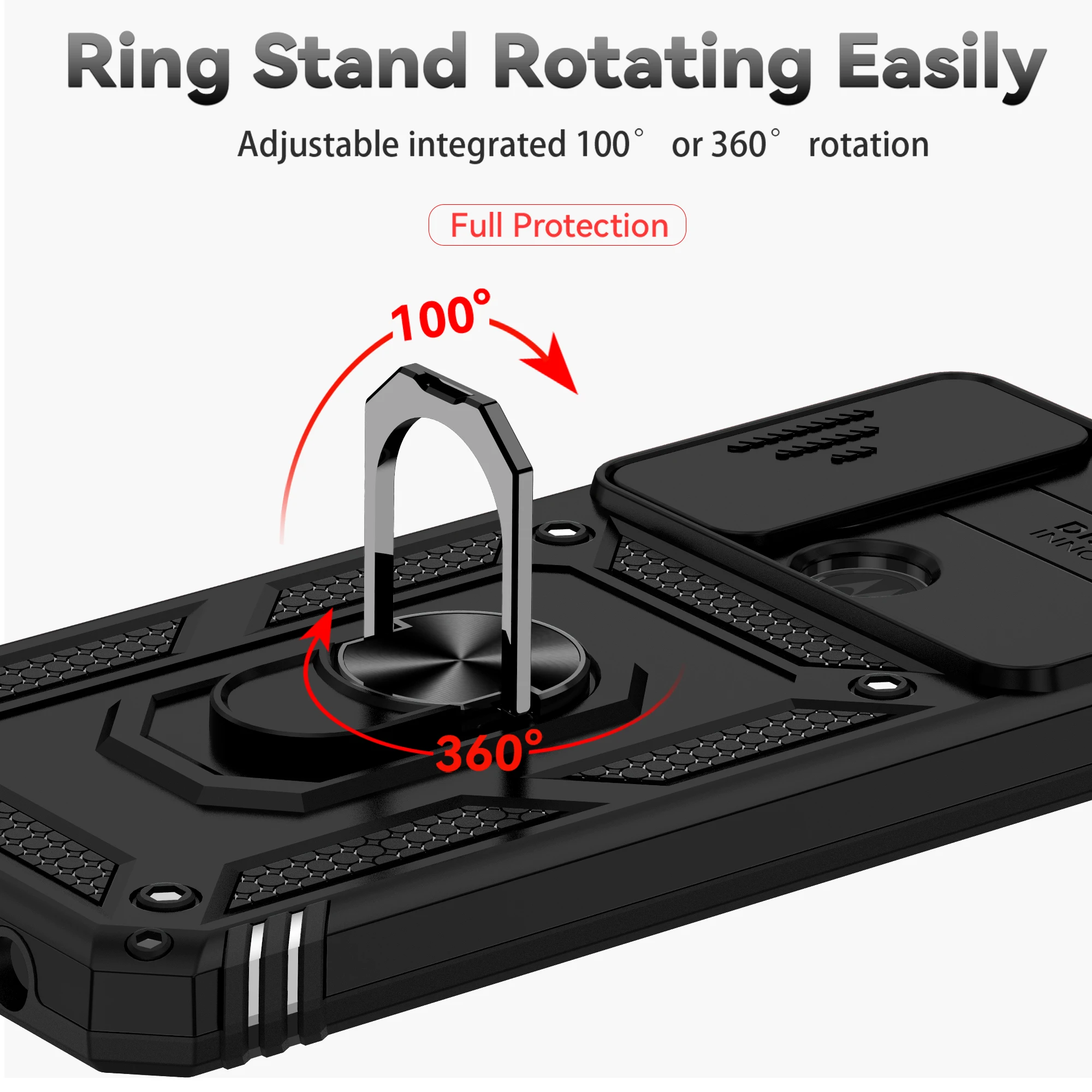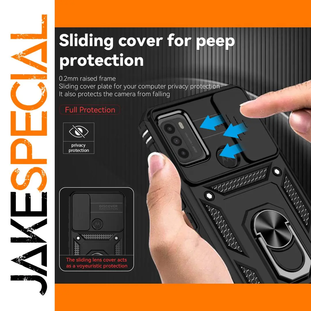 Experience ultimate protection with this rugged black case designed specifically for the Motorola Moto G50 4G. Crafted with a dual-layer construction of durable plastic and textured rubber armor, it offers superior shockproof and anti-scratch defense. The sleek matte finish on the slide camera cover complements the glossy phone surface, creating a sophisticated and modern aesthetic. Reinforced with a raised frame around the camera and textured hexagon patterns on the back, this case provides non-slip grip and enhanced durability. Functional features include a magnetic dustproof cover, a 360-degree ring finger stand for hands-free use, and a secure holder or kickstand. Its full-coverage design superbly combines luxury style with rugged, heavy-duty resilience, making it an ideal choice for anyone seeking reliable, stylish protection for their Moto G50 4G.