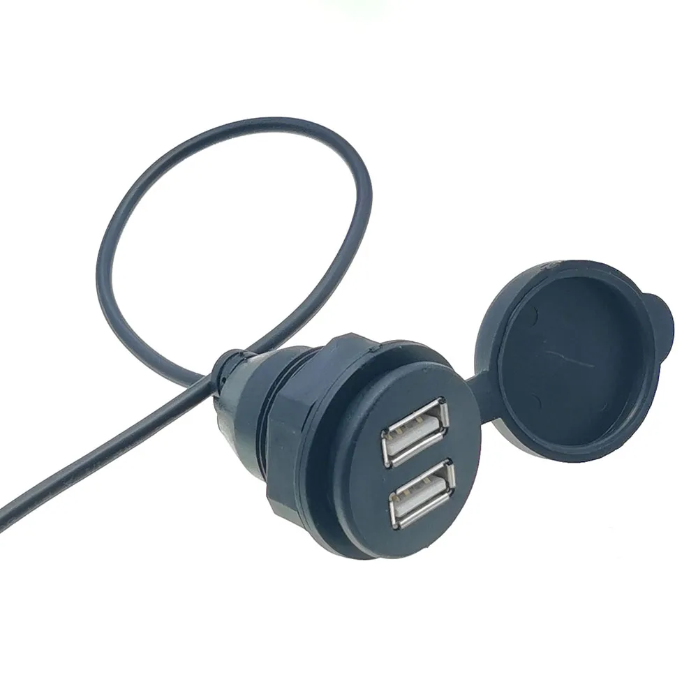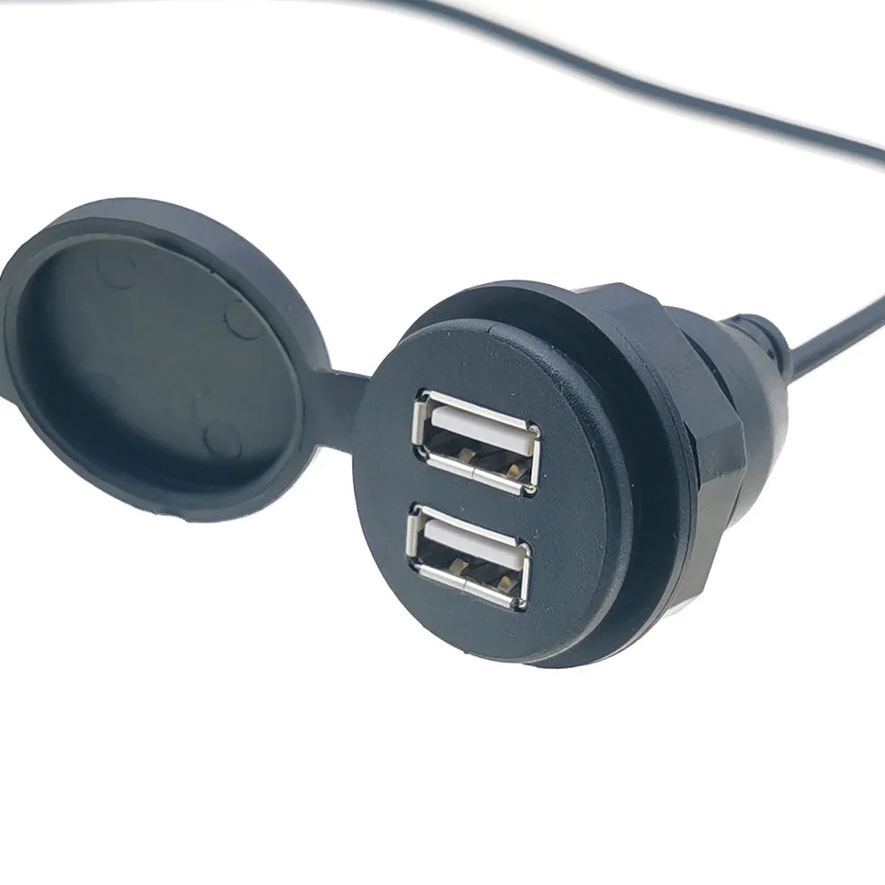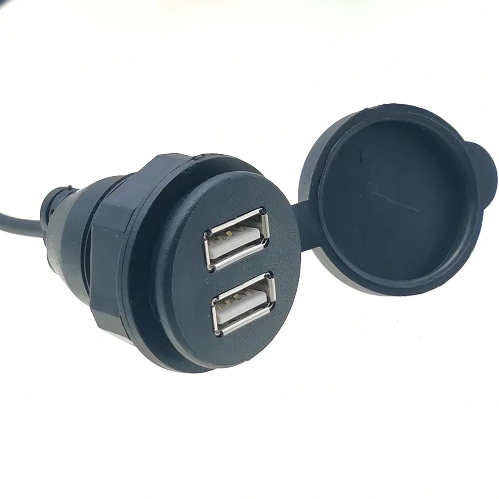 Step into a world of reliable power with this durable black USB power outlet, designed specifically for automotive or outdoor environments. Featuring a sleek, circular design with a matte finish, it exudes a modern, robust aesthetic that seamlessly blends with your vehicle's interior or outdoor setup. The device includes a protective oval-shaped dust cover that hinges open, ensuring your USB ports stay clean and shielded from dust, dirt, and environmental elements. Equipped with two vertically stacked USB 2.0 ports, each with metallic interiors, it provides a sturdy connection for your charging needs. Its threaded installation allows for secure fitting into panels or enclosures, making it the perfect combination of functionality and style for your power distribution needs.