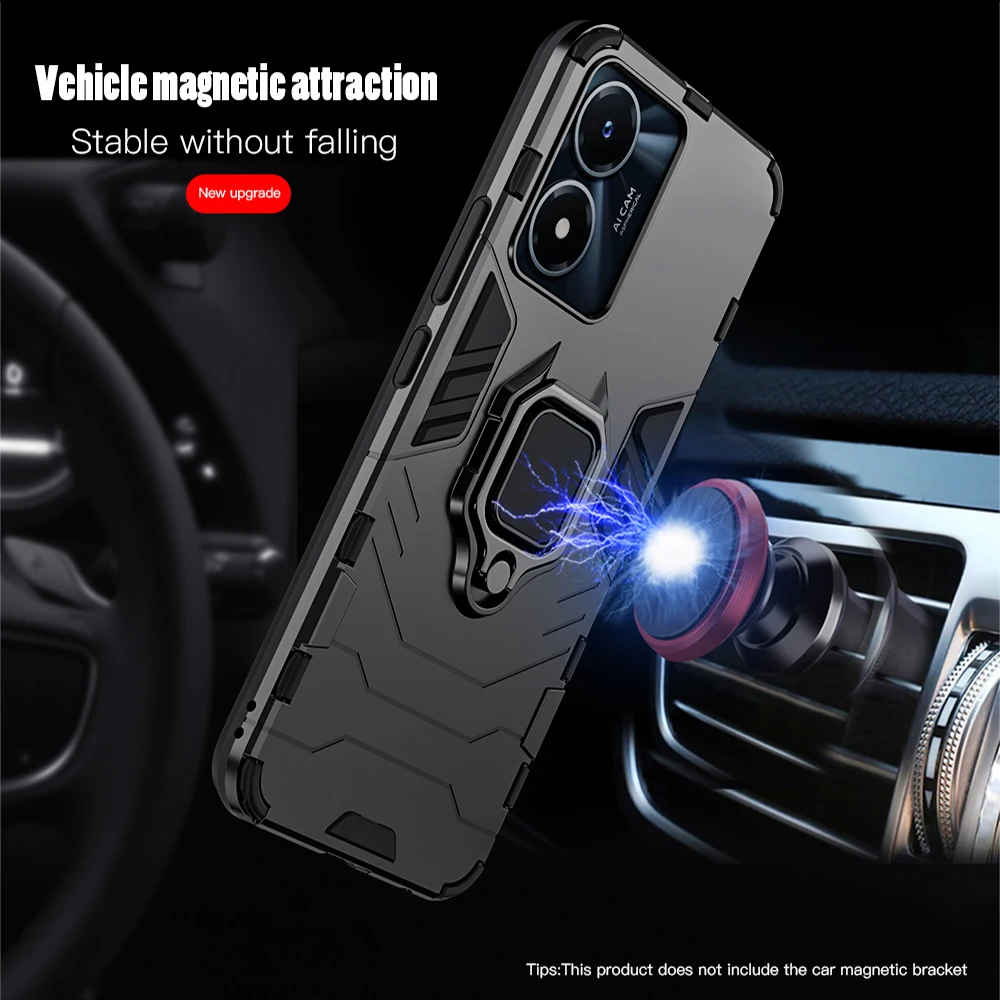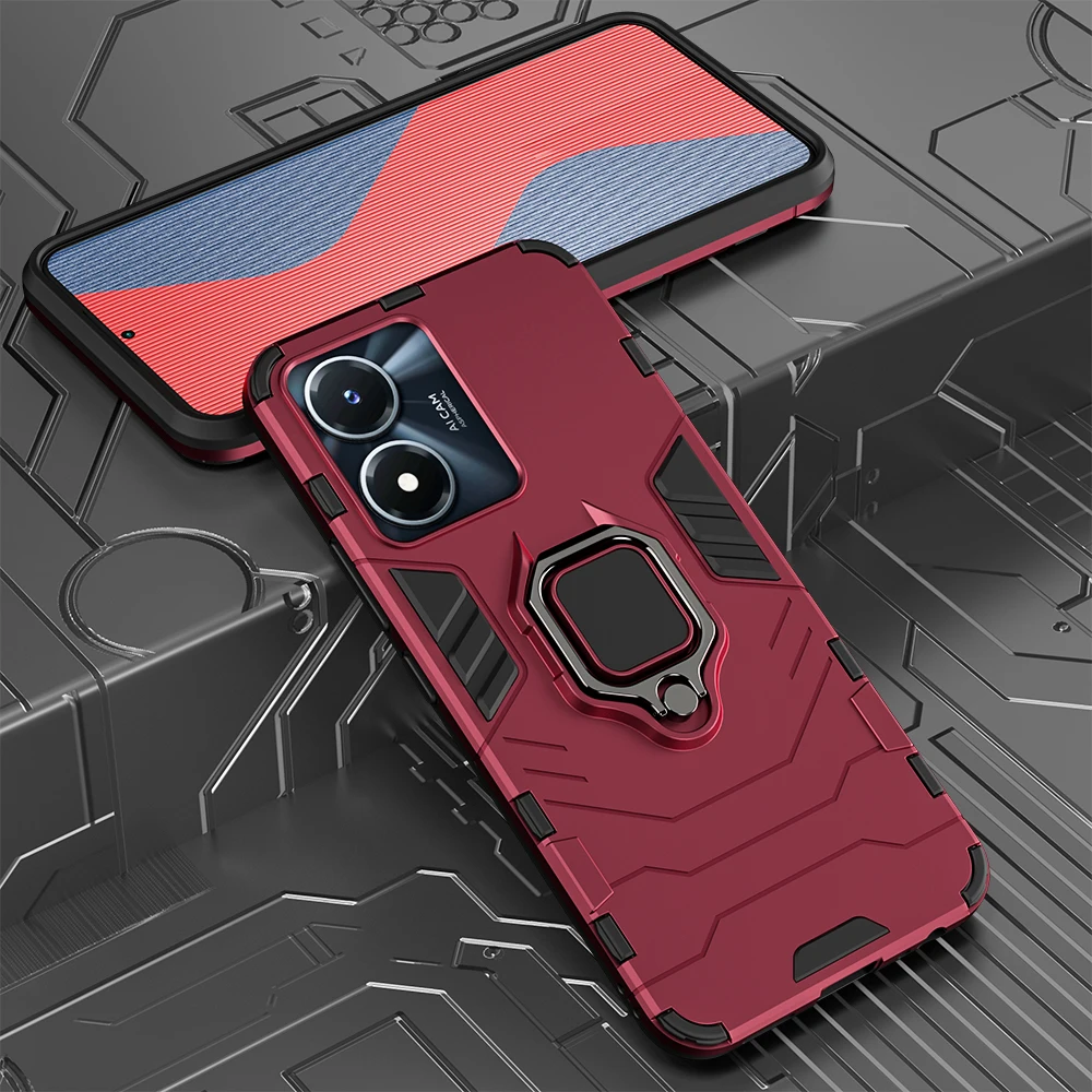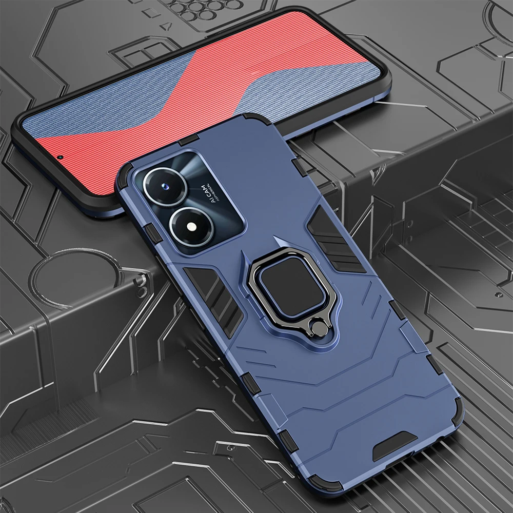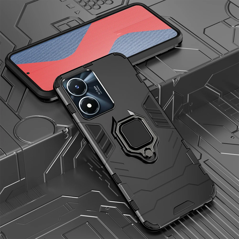 Experience ultimate protection with this rugged geometric case designed specifically for the VIVO Y02S and Y77 5G models. Crafted from durable silicone and polycarbonate, it offers a stylish yet tough exterior with angular patterns and raised lines that mimic an armor-like appearance. The matte finish reduces glare and fingerprints, keeping your phone looking sleek and clean. The metallic ring stand enhances usability by offering a secure grip and convenient stand functionality, perfect for hands-free viewing. This case integrates seamlessly with your device, providing easy access to all ports and buttons. Its robust construction ensures your phone is shielded from shocks, scratches, and dust, giving you peace of mind while maintaining a modern, technical aesthetic.Understand the style and strength this case provides—perfect for everyday use or outdoor adventures.