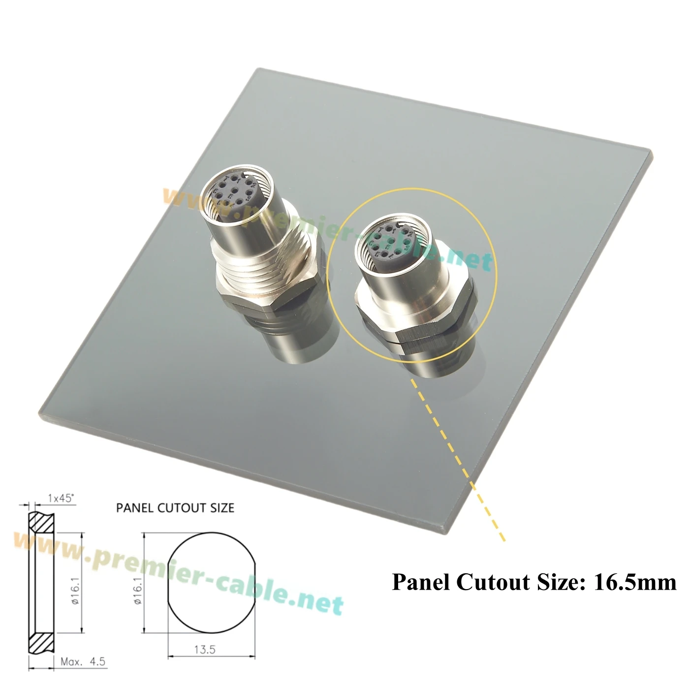 Discover the reliability and industrial strength of this high-quality M12 A Code 8 Pin female to female bulkhead connector. Designed for demanding environments, this connector features a polished, metallic cylindrical body that reflects its durability and precision engineering. Its rugged construction combines a threaded metal coupling and a panel mount system, which securely fastens to control panels, automation systems, and enclosures. The black insulating base with a precise circular contact arrangement of gold-plated copper pins provides excellent electrical conductivity and corrosion resistance. Its IP67-rated waterproof and dustproof enclosure ensures sealed protection, even in harsh industrial conditions. Easy to install with a 16.5mm panel cutout, this connector offers a seamless solution for sensor, automation, and robotics applications. Trust this connector to deliver consistent, reliable performance under extreme conditions.