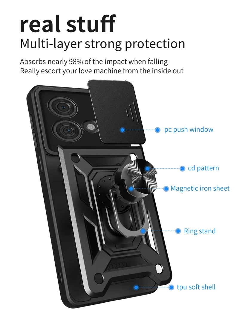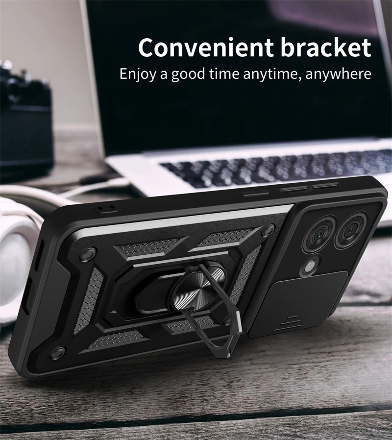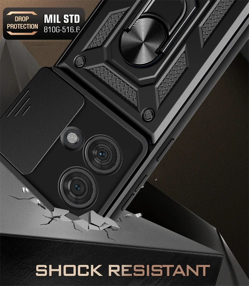 Enhance your Motorola Edge 40 Neo 5G with this rugged, dual-layer phone case featuring a heavy-duty black plastic construction. Its tactical design includes textured grips, angular accents, a large metallic-finish ring holder, and reinforced corners for superior impact protection. The case offers a magnetic support bracket, kickstand for hands-free viewing, and a semi-coverage style for effective protection while maintaining a sleek appearance. Available in seven vibrant colors including rose gold, green, blue, gold, red, silver, and classic black, this versatile accessory combines robustness and functionality to keep your device safe and stylish in any situation.