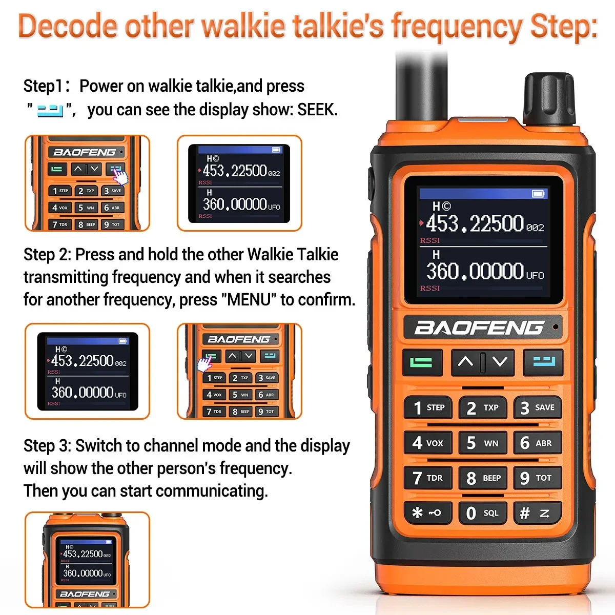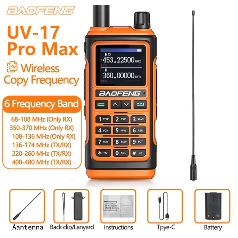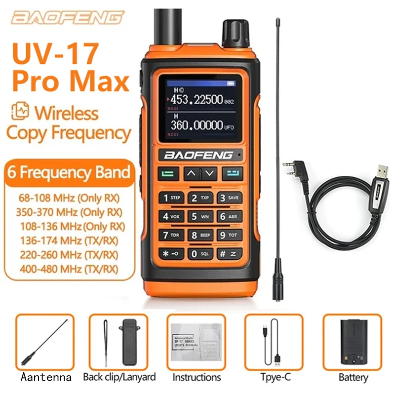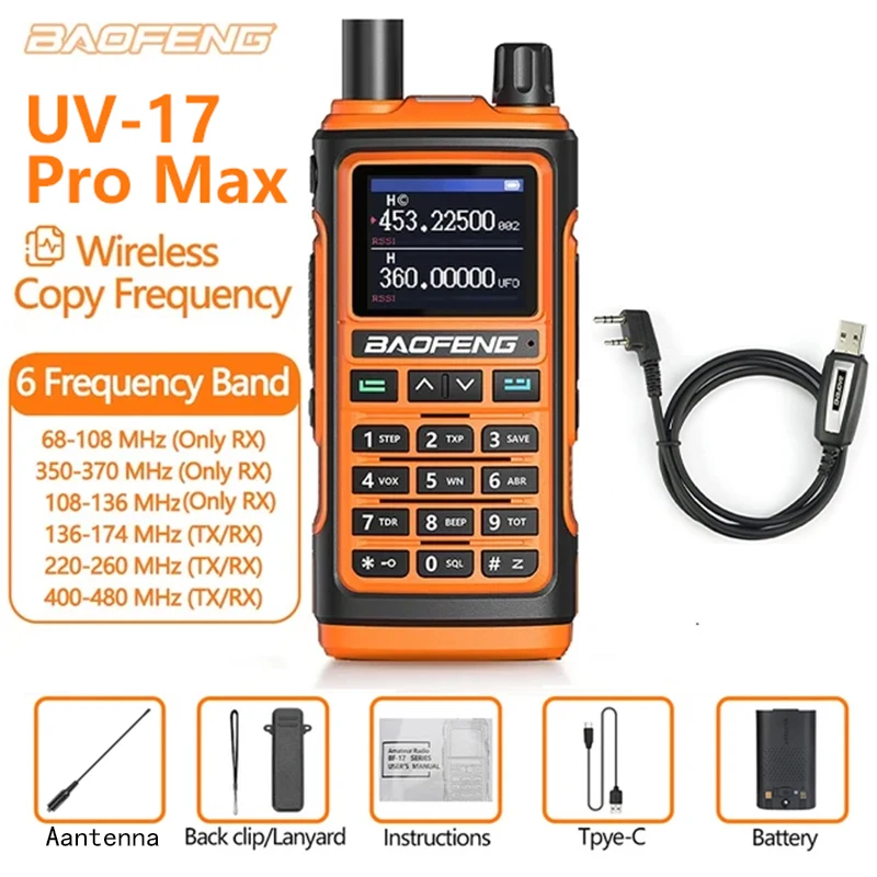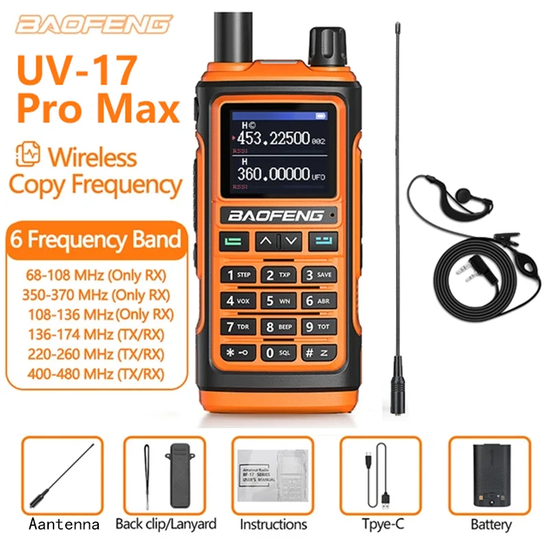 Experience reliable, long-range communication with this rugged orange Baofeng UV-17pro Max Walkie Talkie. Designed for outdoor enthusiasts and professionals, it combines durability with advanced digital features. Its bold orange and black casing ensures high visibility and toughness. The 1.77-inch HD display provides clear, detailed information, supporting dual frequency and channel modes for easy navigation. With a robust 6-band frequency range, including air, FM, and TX/RX capabilities across multiple MHz bands, you’re prepared for varied environments. The powerful 5W-10W output reaches distances of up to 10 km, making it ideal for outdoor activities, security, or team coordination. Whether you're hiking, working, or emergency prepping, this device is your dependable companion for seamless communication.
