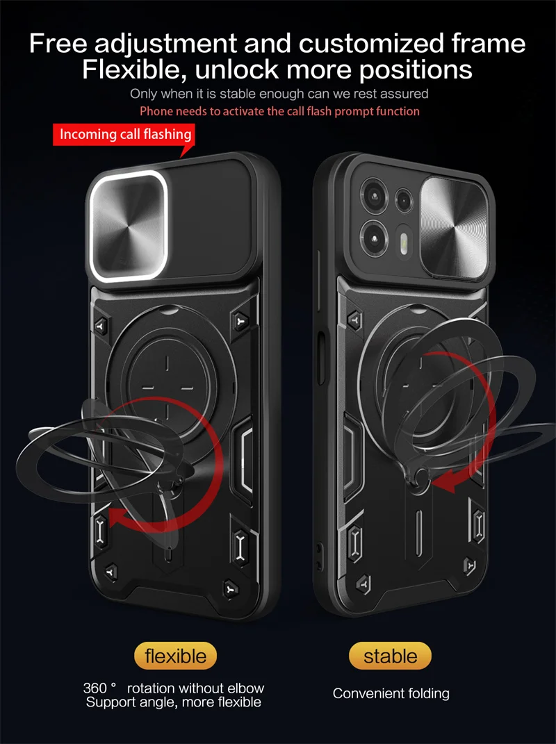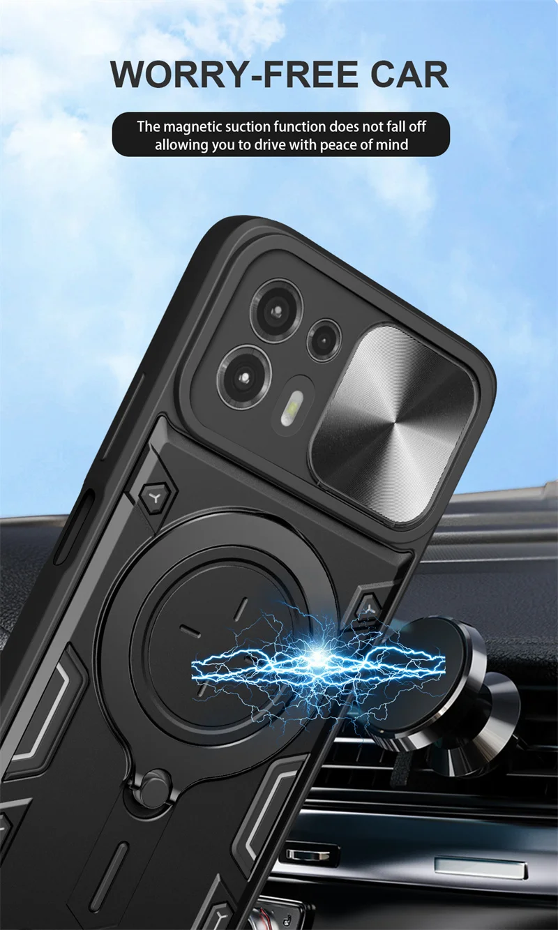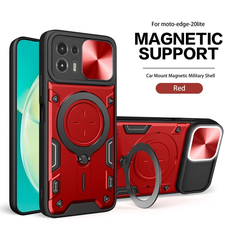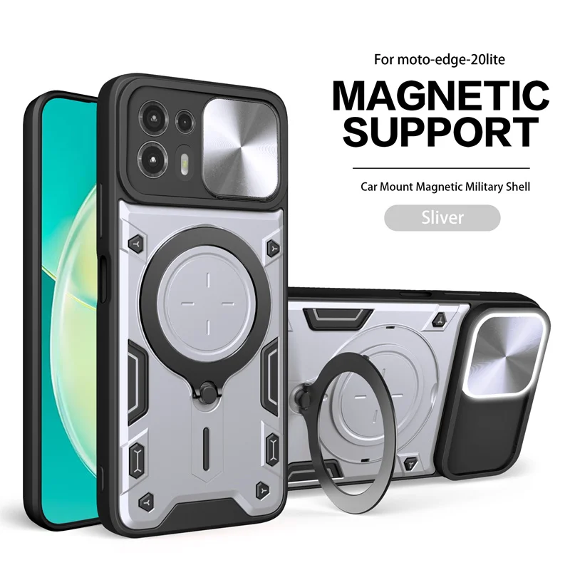 Experience ultimate protection with this robust black phone case designed specifically for the Moto Edge 20 Lite. Crafted with a dual-layer construction, it offers excellent shockproof and heavy-duty defense against drops, scratches, and dust. The textured edges ensure a non-slip grip, while modern geometric accents add a sporty aesthetic. The built-in 360-degree alloy ring stand allows for versatile screen viewing and secure holding, perfect for on-the-go use. Additionally, a magnetic support bracket enhances compatibility with magnetic accessories, making it highly functional. The push-pull slide window covers the camera lens, protecting it from dust and scratches while maintaining easy access. This sleek, minimalist design combines durability with style, giving your device a sophisticated look that peaks in functionality and safety.