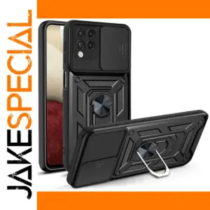 Protect your Samsung Galaxy A12, M12, or F12 with this rugged, high-quality shockproof case featuring a durable plastic shell and textured rubber armor for enhanced durability and grip. It offers full coverage with reinforced edges and a semi-closed design, including a sliding camera lens protector and a 360-degree ring finger stand for hands-free convenience. Lightweight yet heavy-duty, the case is dustproof, anti-scratch, anti-fingerprint, and equipped with a kickstand and holder for versatile use. Available in black, navy blue, and red, it combines tactical style with practical functionality, ensuring your phone stays safe and accessible in everyday use.