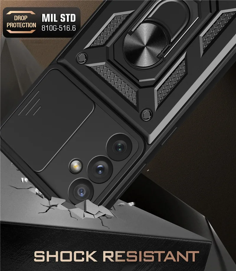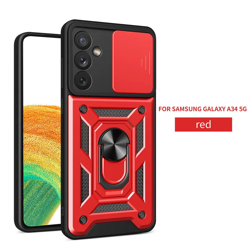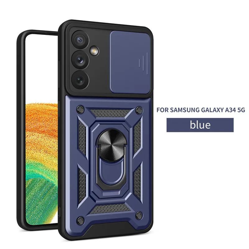 Imagine owning this high-performance Samsung Galaxy A34 5G case that seamlessly combines rugged design with practical features. Crafted from a dual-layer of durable rubber and hard plastic, it guarantees impact resistance and robust protection for your device in any situation. Its textured surface enhances grip and reduces fingerprints, ensuring your phone stays clean and secure. The slide push-pull window offers quick access to the camera lens, while the built-in 360-degree rotatable ring stand provides effortless hands-free viewing. With a magnetic closure, dustproof design, and reinforced bumper, this case specifically safeguards your phone against scratches, drops, and daily wear and tear. Elevate your device’s style and functionality with this premium accessory.