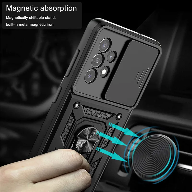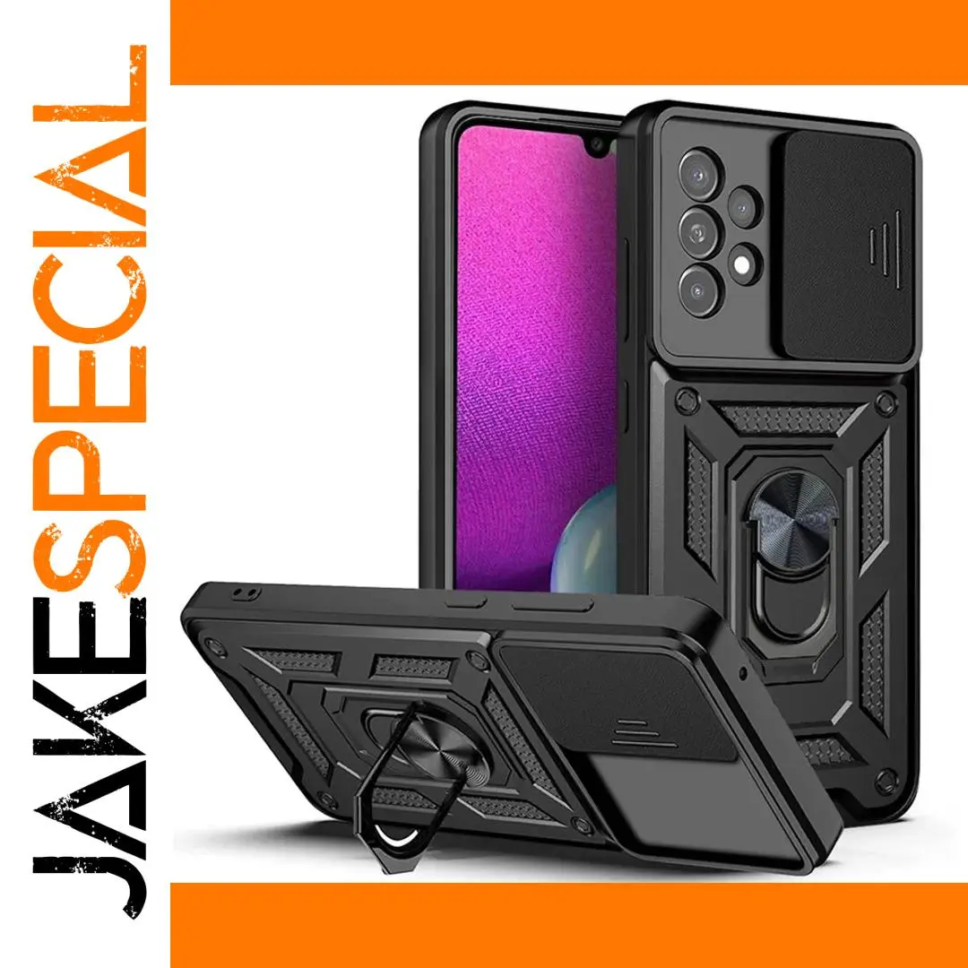 Experience unmatched protection with this highly durable case designed exclusively for Samsung Galaxy A13, A23, A33, A53, and A73 models. Crafted with a tough plastic shell and reinforced rubber armor, this case offers superior shockproof capabilities and resists scratches, fingerprints, and dust. Its textured surface enhances grip, ensuring your device stays firmly in your hand. The integrated, sleek metallic-looking ring holder doubles as a 360-degree kickstand, allowing you to view videos hands-free at any angle. A slide push-pull window safeguards your camera lenses while maintaining easy access. Available in classic black, navy blue, and vibrant red, this heavy-duty case blends practicality with modern style, making it perfect for everyday use or rugged adventures.