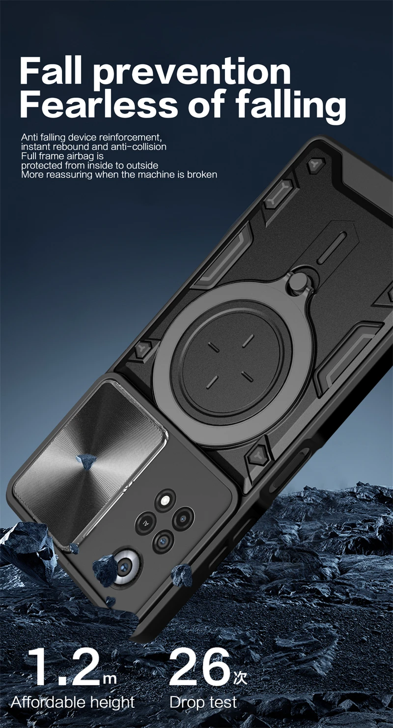 Experience the perfect combination of durability and sleek design with this Xiaomi Poco X4 Pro 5G case. Crafted from high-quality plastic, it offers a rugged, shockproof shell built to withstand daily impacts, dust, and scratches. The semi-open, half-wrapped structure surrounds your phone with reinforced bumpers, providing excellent shock absorption while maintaining ease of access. The case features a slide camera lens protector for safeguarding multiple lenses and sensors, ensuring they remain dust-free and scratch-free. Its textured, anti-slip surface enhances grip, reducing the risk of accidental drops. With a built-in 360-degree rotate kickstand, you can enjoy hands-free viewing in both horizontal and vertical orientations. The sleek metallic ring holder adds versatility, supporting magnetic accessories or car mounts, making every journey seamless. Available in vibrant colors, this case embodies ruggedness without sacrificing style, empowering you to keep your device protected and looking great.
