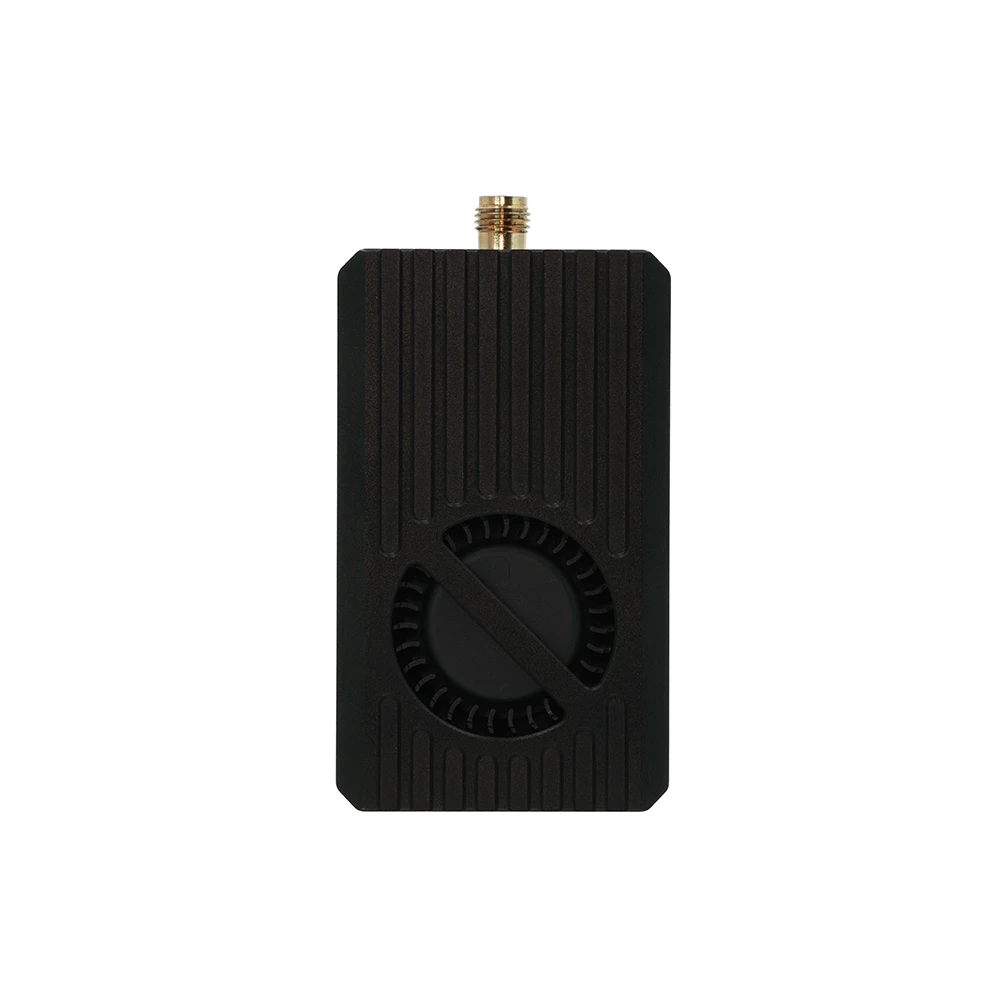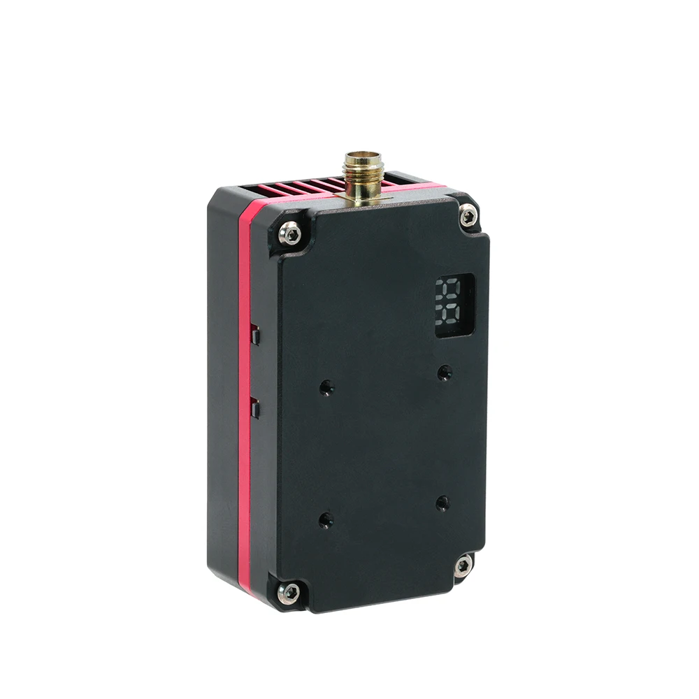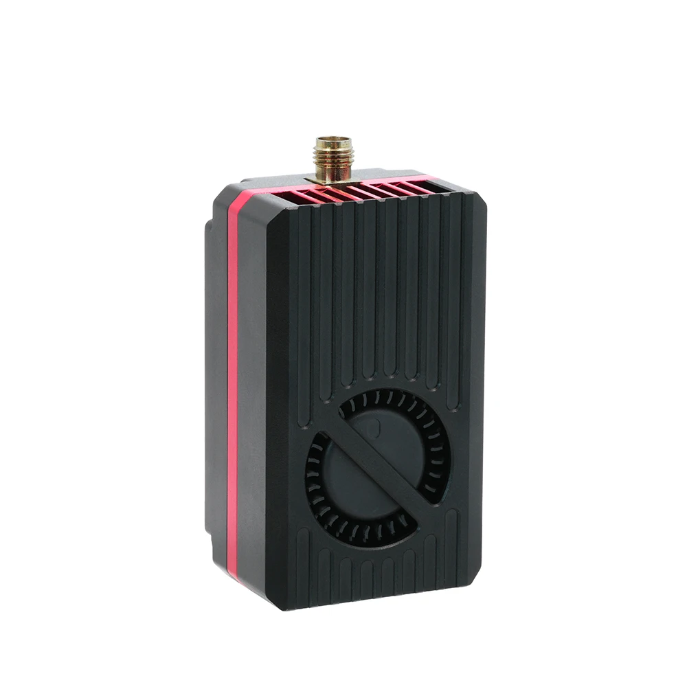 Elevate your FPV drone adventures with the RUSHFPV 4.9G-6.0G 10W Video Transmitter. This state-of-the-art VTX unit boasts a sleek rectangular design in matte black, adorned with a striking red band that enhances its modern aesthetic. It features 80 channels to ensure clear transmission over longer distances, allowing you to immerse yourself in the FPV experience. The textured surface provides optimal grip while facilitating heat dissipation during use. Complete with a high-frequency, slender antenna and vibrant colored wires, this unit is engineered for both style and performance. Visualize yourself soaring through the skies with unmatched clarity and control with this premium VTX.
