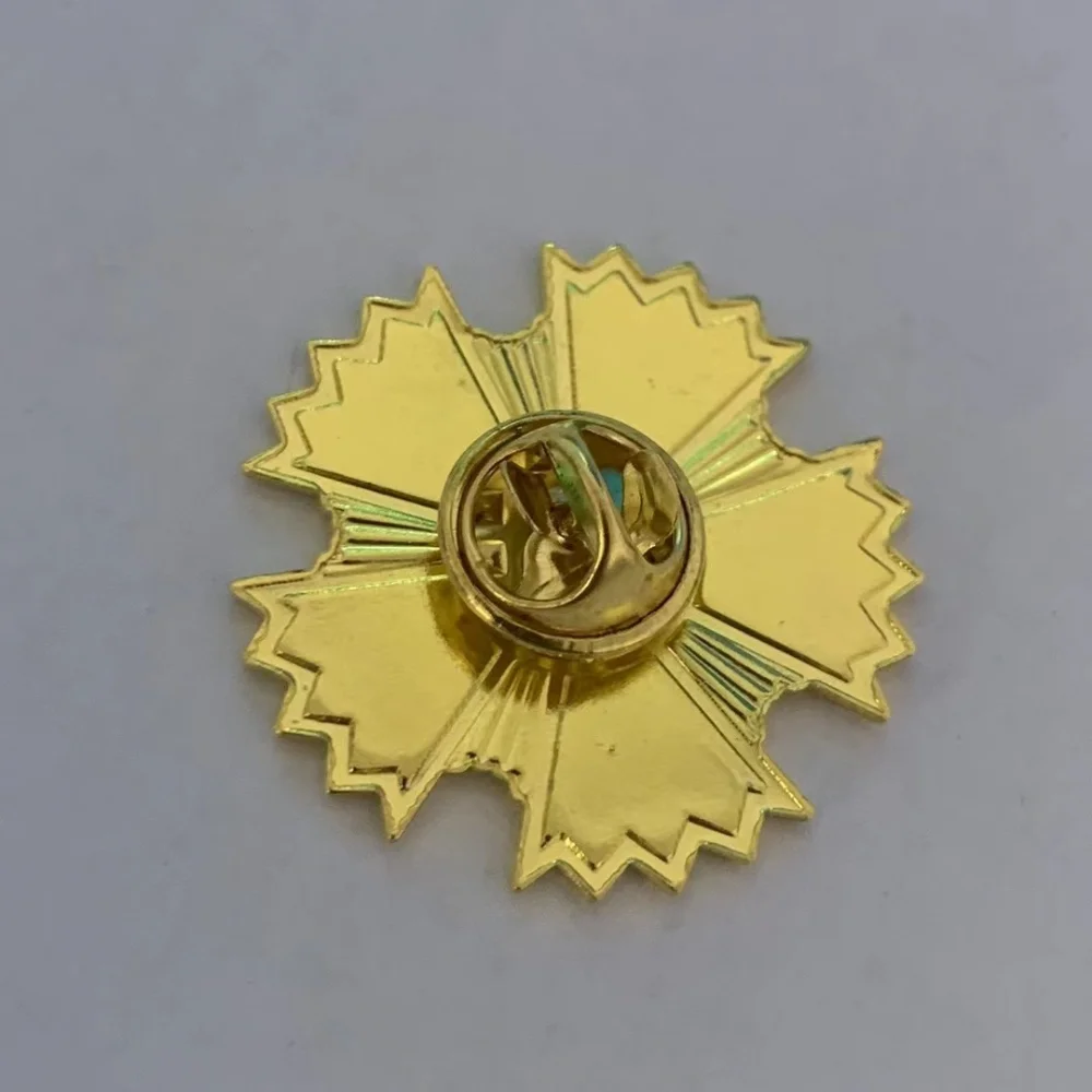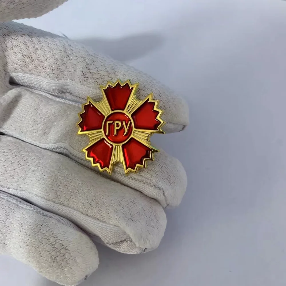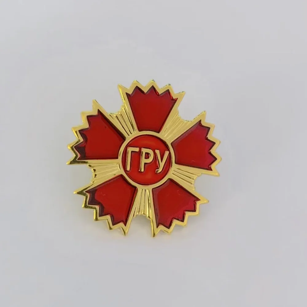 This remarkable Russia GRU badge medal showcases a striking retro design that embodies military symbolism and patriotism. Made from a durable metal alloy, this vibrant red badge features a star shape with pointed petals resembling a stylized flower. The center is adorned with Cyrillic letters “ГРУ,” prominent against the red backdrop, creating an eye-catching focal point. Angular points extend outward, adding to the badge's dynamic look. The shiny gold edges enhance the vintage aesthetic, making it a perfect accessory for jackets, backpacks, hats, or DIY clothing projects. Measuring 3.2 cm in diameter, this versatile badge is ideal for unisex wear, making it suitable for any enthusiast.
