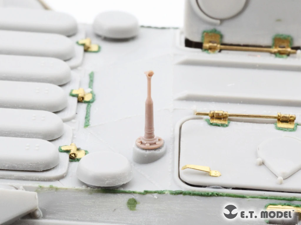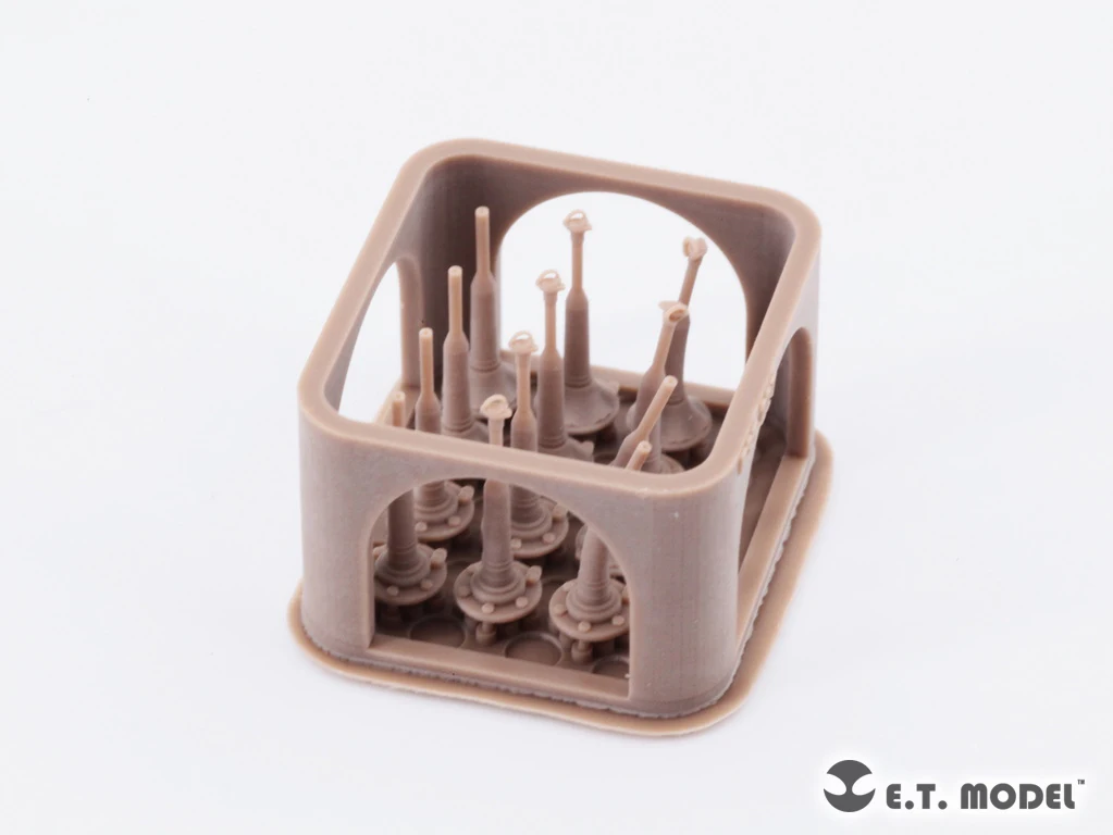 - Technical specifications include: resin material, scale 1:35, unpainted appearance, textured mounting bases, varied mast heights, and detailed top components.
