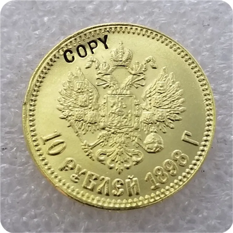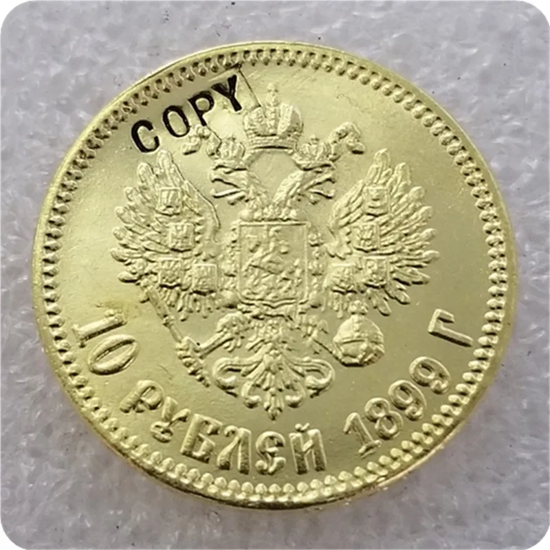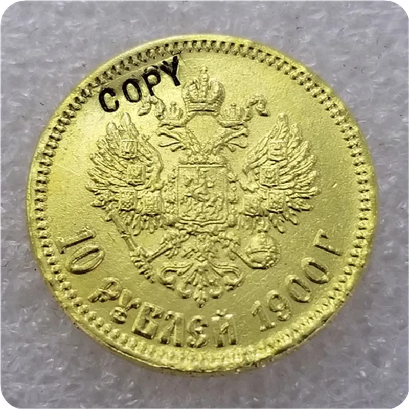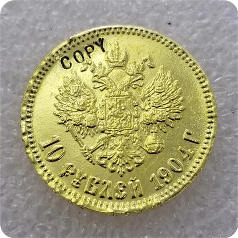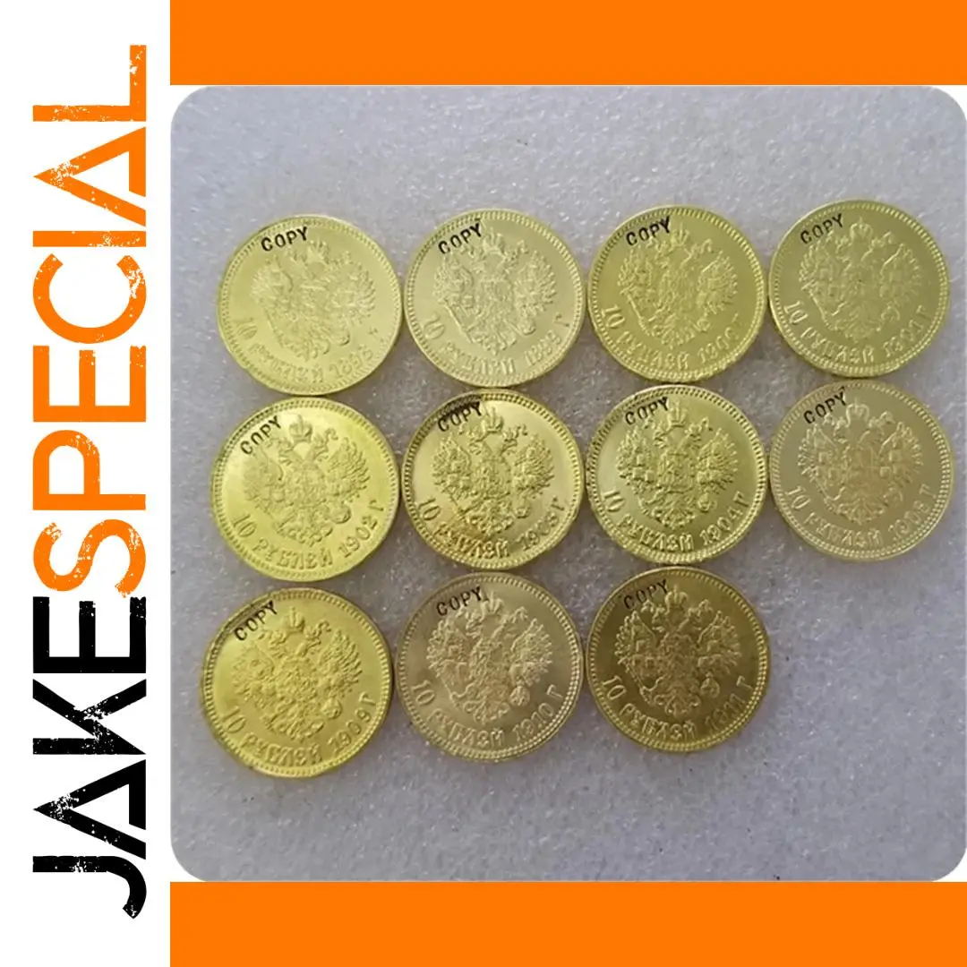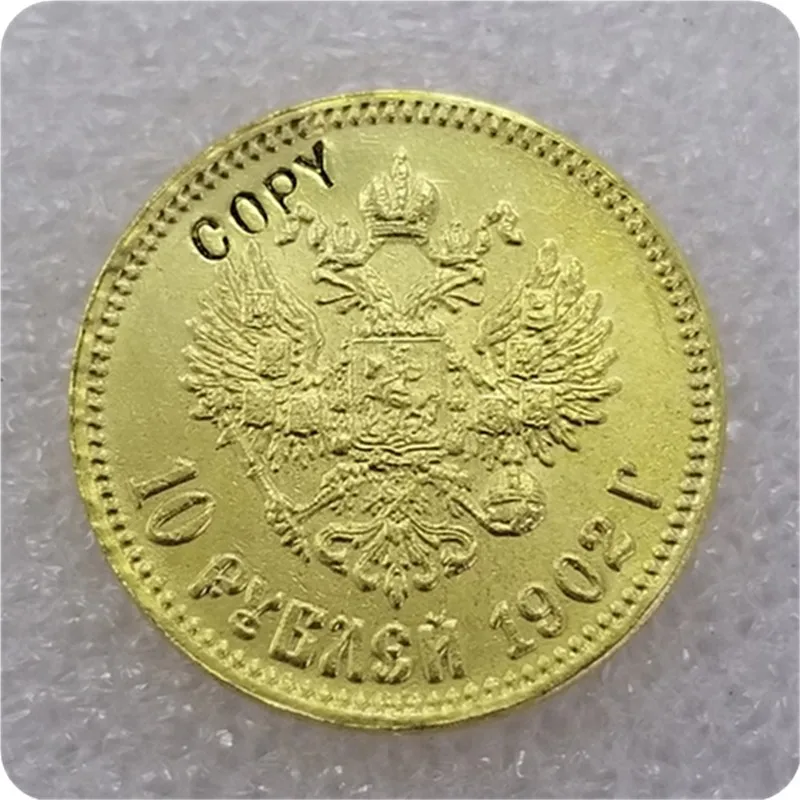 This beautifully crafted replica of the 10 Rouble from Russia, dating from 1898 to 1911, features intricate casting and detailed embossing, including a double-headed eagle emblem at the center, surrounded by fine patterns and ridged edges. Made from durable metal with a shiny, gold-like finish, each piece captures the historical essence of Czar Nicholas II’s era. Available in colors corresponding to different years such as 1898, 1899, 1900, and others, this collectible showcases authentic antique design, making it an ideal display piece, conversation starter, or thoughtful gift for numismatic enthusiasts and collectors alike.