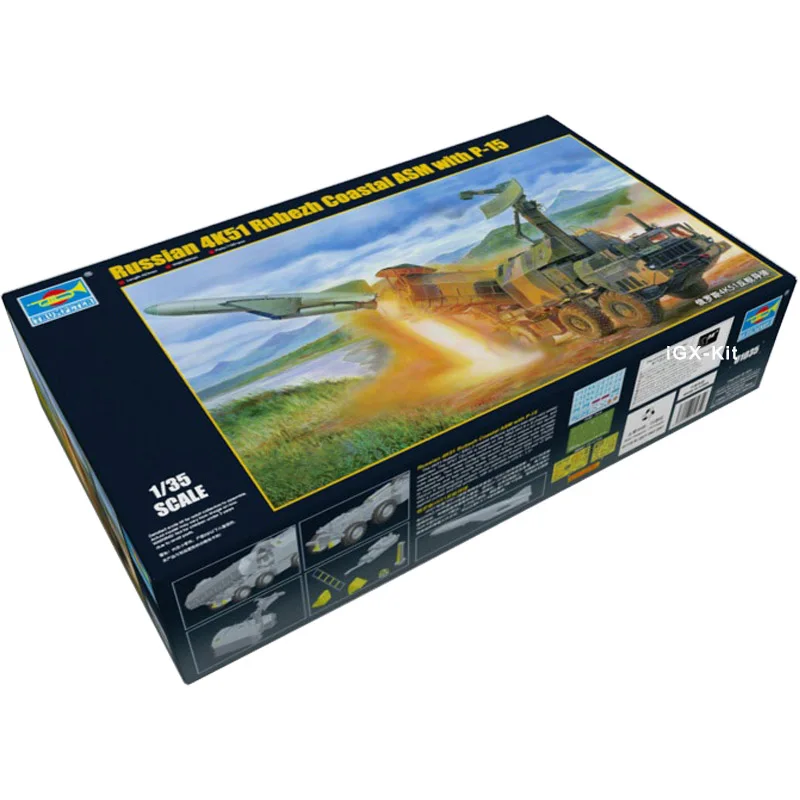 Bring realism to your collection with this detailed 1:35 scale plastic model kit of the Russian 4K51 Rubezh coastal anti-ship missile system. Measuring 423mm in length and 88mm in width, it features over 1,100 intricately crafted parts, including metal copper cables and two photo-etched components. The kit boasts a full drivetrain assembly with engine transmission, differential housing, and suspension units, along with hollow rubber tires displaying realistic tread patterns and clear parts for the windshield and side windows. Designed for experienced hobbyists aged 14 and above, this highly detailed model captures the operational essence of the missile system, perfect for military modeling enthusiasts.