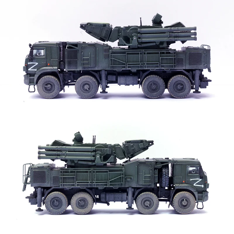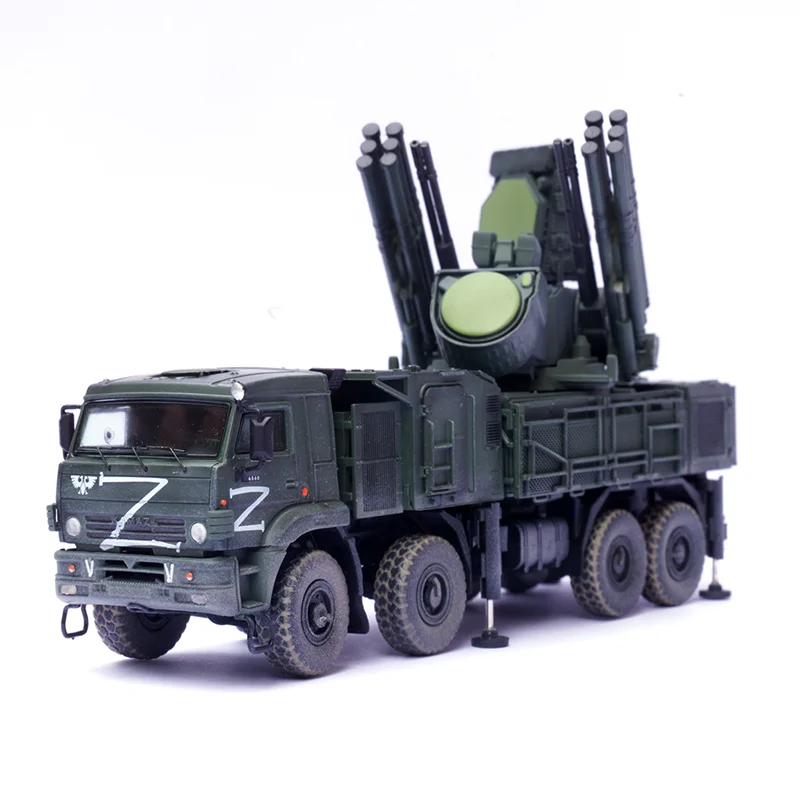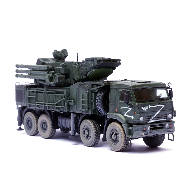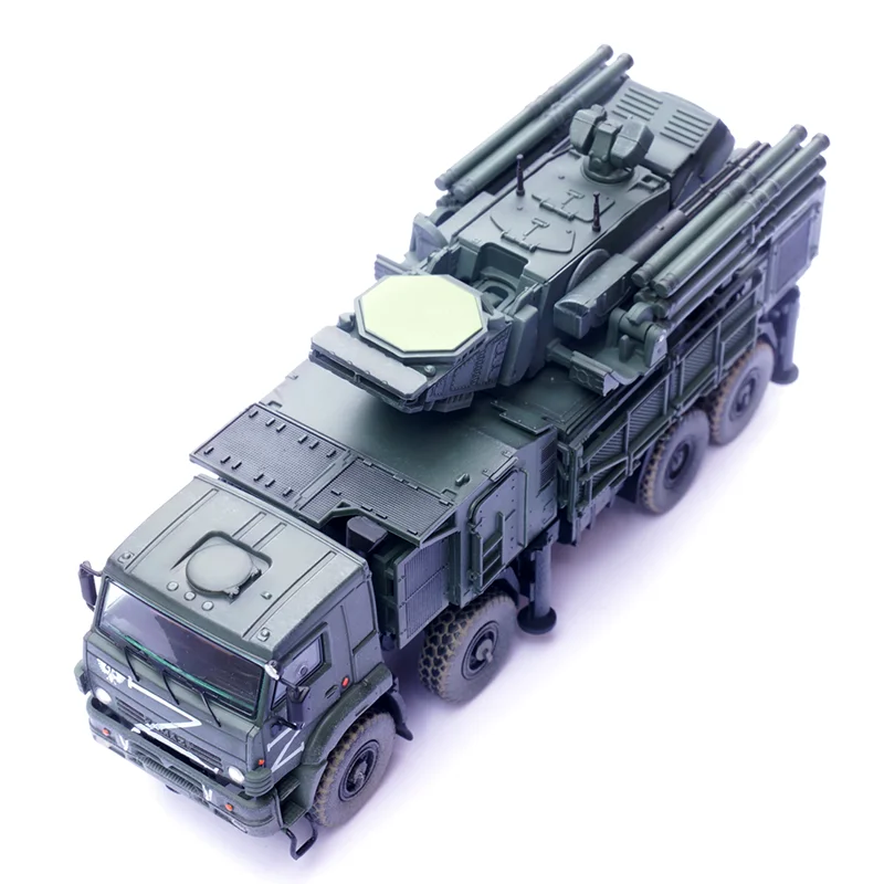Enhance your collection with this meticulously crafted 1/72 scale Russian Armor S1 Air Defense Weapon System model. Made from durable PVC plastic, it showcases superb craftsmanship with detailed panel lines, textured surfaces, and realistic markings. The vehicle is painted in a military green hue, featuring white military symbols and insignias, including a stylized eagle emblem and prominent “Z” markings. The rugged chassis and wheels with textured tires and metallic accents add to its authenticity. The missile launcher, mounted on a rotating turret, displays intricate structural details and parallel tubes, conveying a sense of tactical military realism. This finished model offers a perfect display piece for enthusiasts who appreciate detailed military replicas, ideal for display shelves or dioramas.
