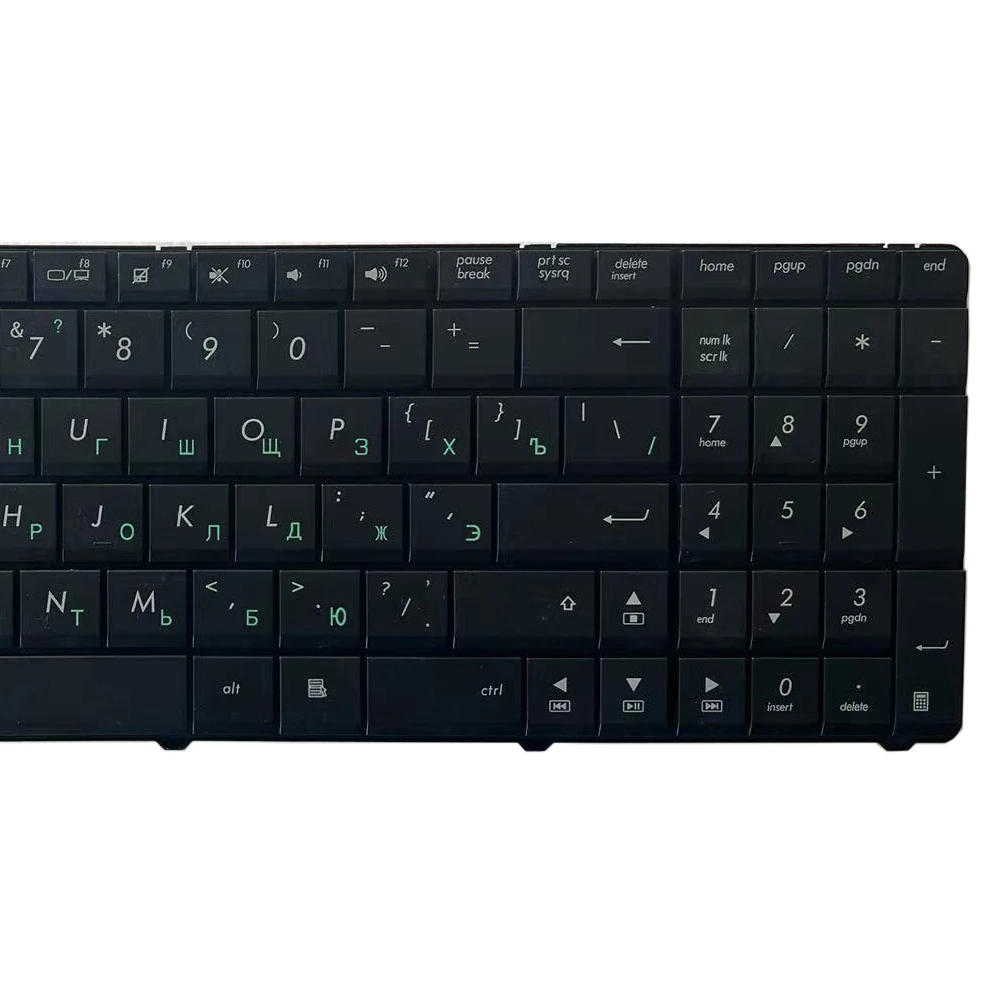 Experience the perfect blend of functionality and style with this new Russian keyboard designed specifically for Asus laptops, including models like N53, K53, X52F, X52D, X52DR, X52DY, X52J, X52JB, X52JR, X55, X55C, X55U, and K73B. Its sleek black surface contrasts sharply with crisp white lettering, making each key easily legible. Vibrant green Cyrillic characters add a colorful, bilingual touch that enhances typing accuracy in both languages. The standard layout includes a dedicated function row, navigation keys, and a slightly larger Enter key for comfortable use. The built-in metallic backing provides durability, while the compact design ensures it fits seamlessly into your workflow. This reliable replacement keyboard will restore your device’s performance and aesthetic appeal effortlessly.