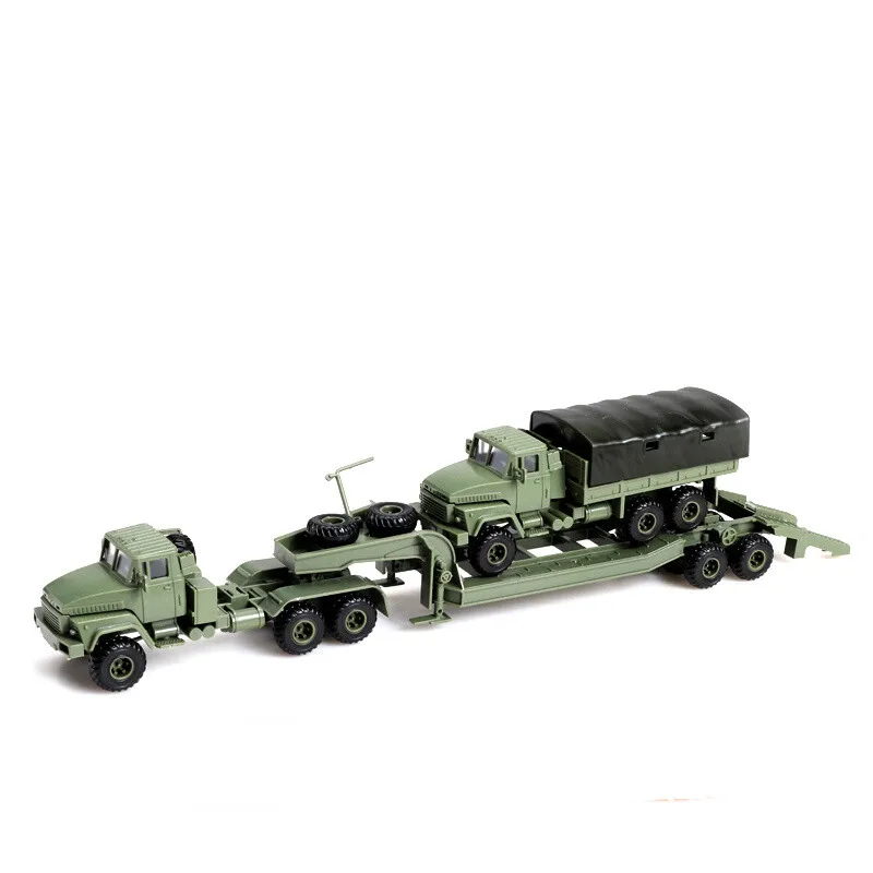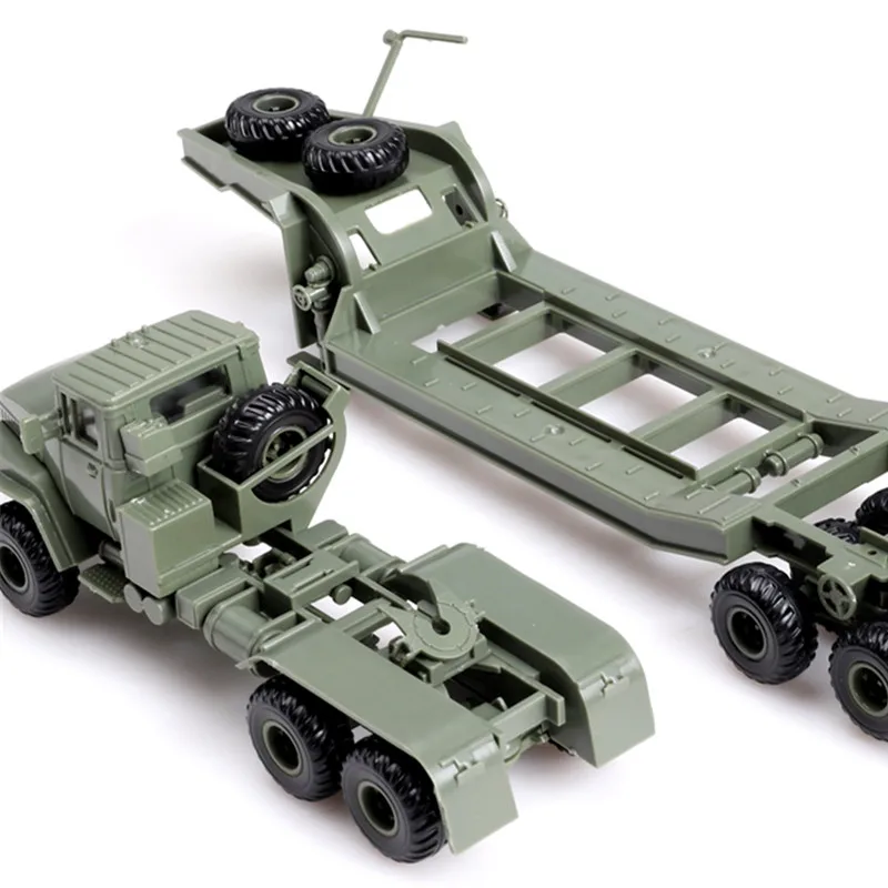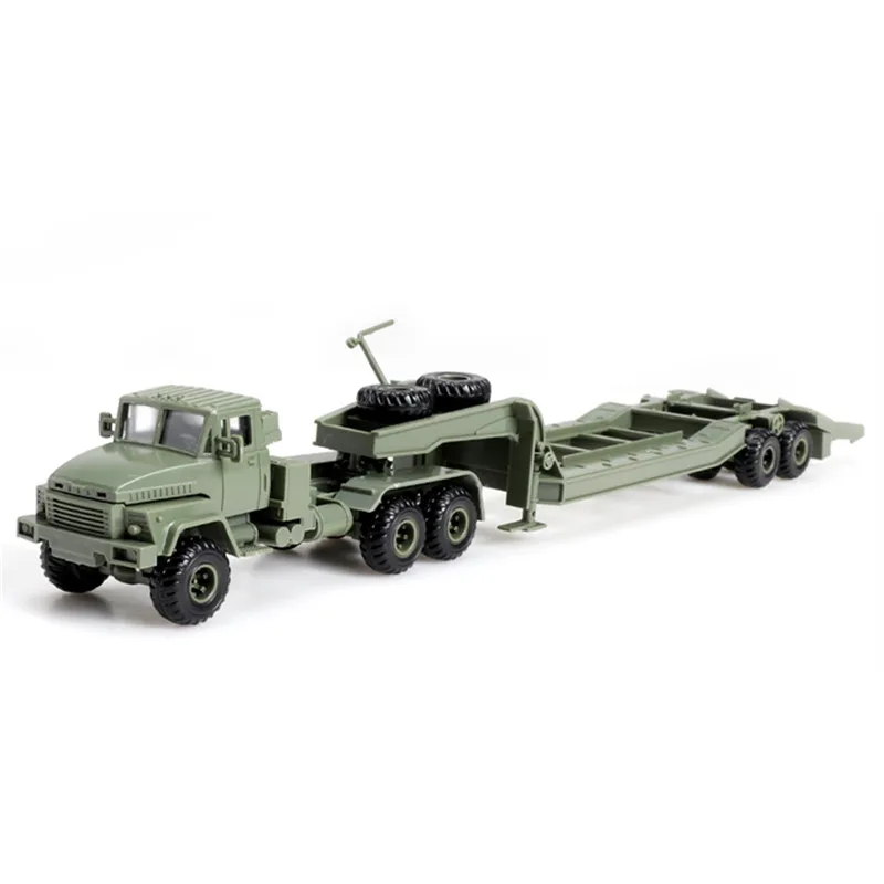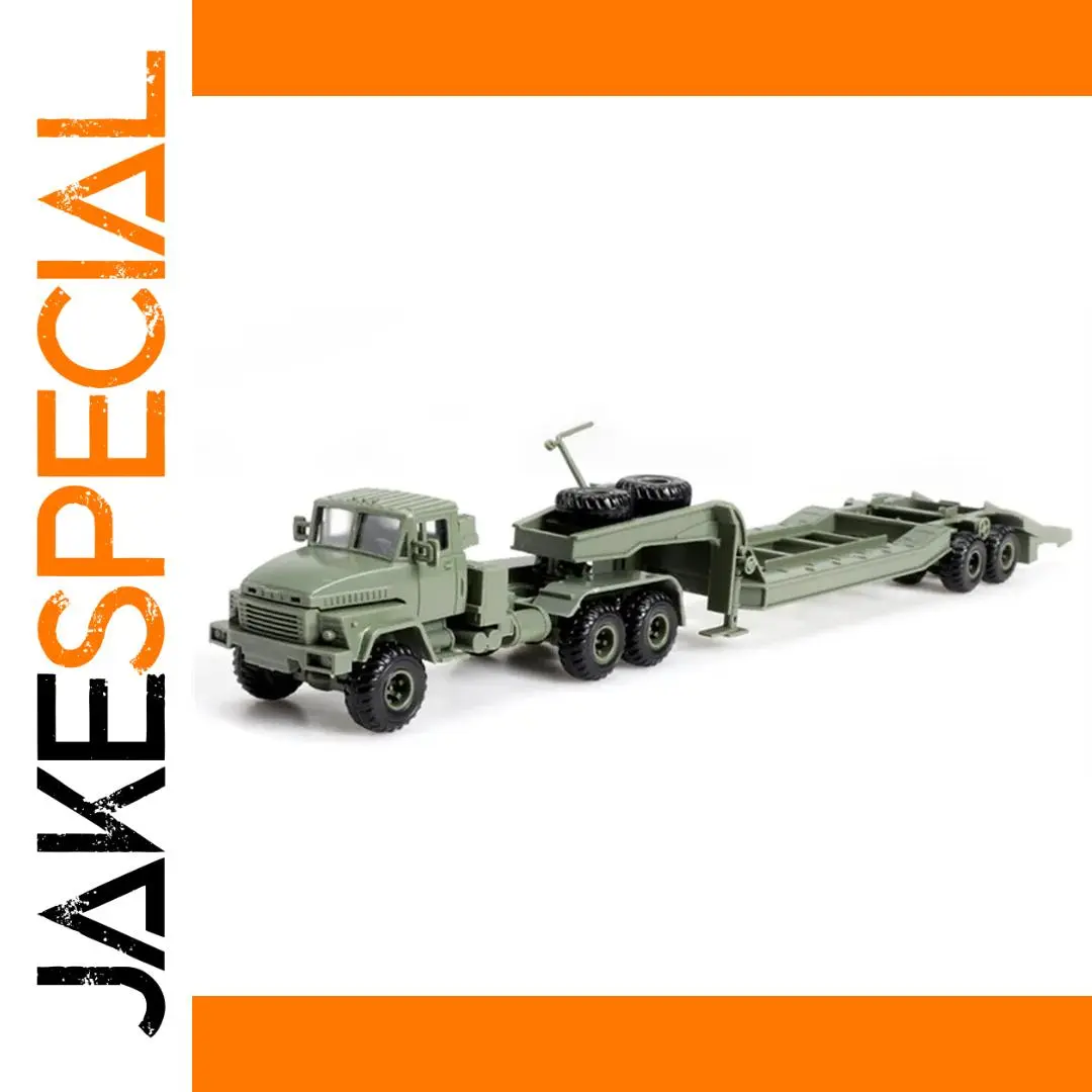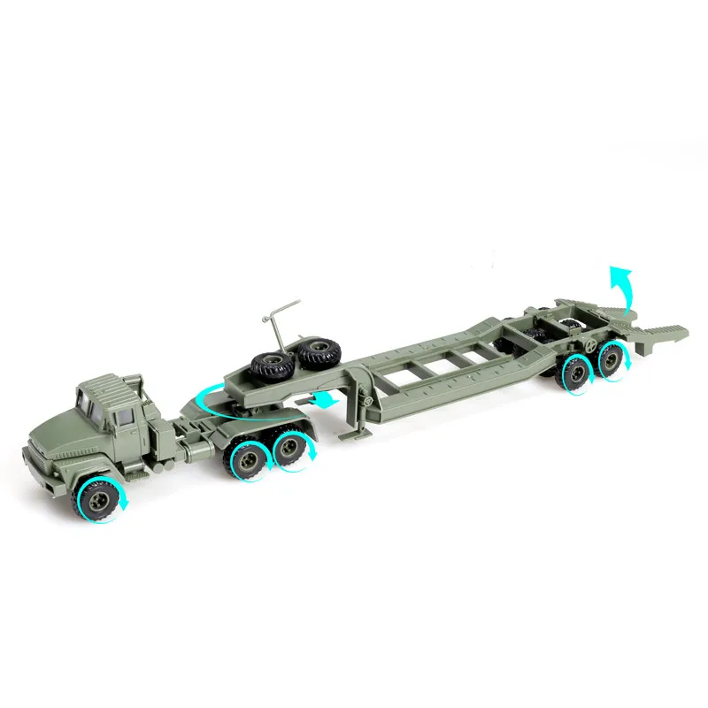 - Authentic military green color captures the rugged camouflage aesthetic of real military vehicles, enhanced by detailed structural elements including grille, headlights, and flatbed trailer.
